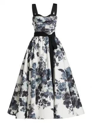 Por supuesto, la reina aprovechó la ocasión para presumir uno de sus looks más femeninos, firmado por Carolina Herrera. Letizia llevó un vestido con escote en forma de corazón, con tirantes negros y estampado de motivos florales. Además, esta pieza se destaca por su falda midi y un lazo en la cintura que estiliza su figura.