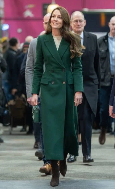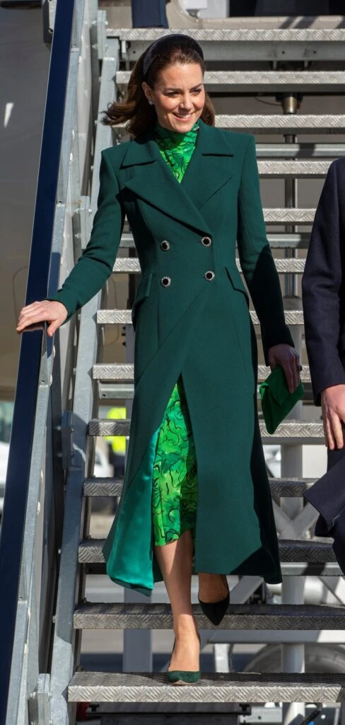 Este look recuerda al utilizado por Kate Middleton durante una visita a Irlanda. Allí se la había podido ver con un saco entallado de Catherine Walker, unos stilettos de Jane Taylor y un clutch haciendo juego. En otra oportunidad, también se la había visto con otro abrigo verde pero que supo combinar con unas botas.