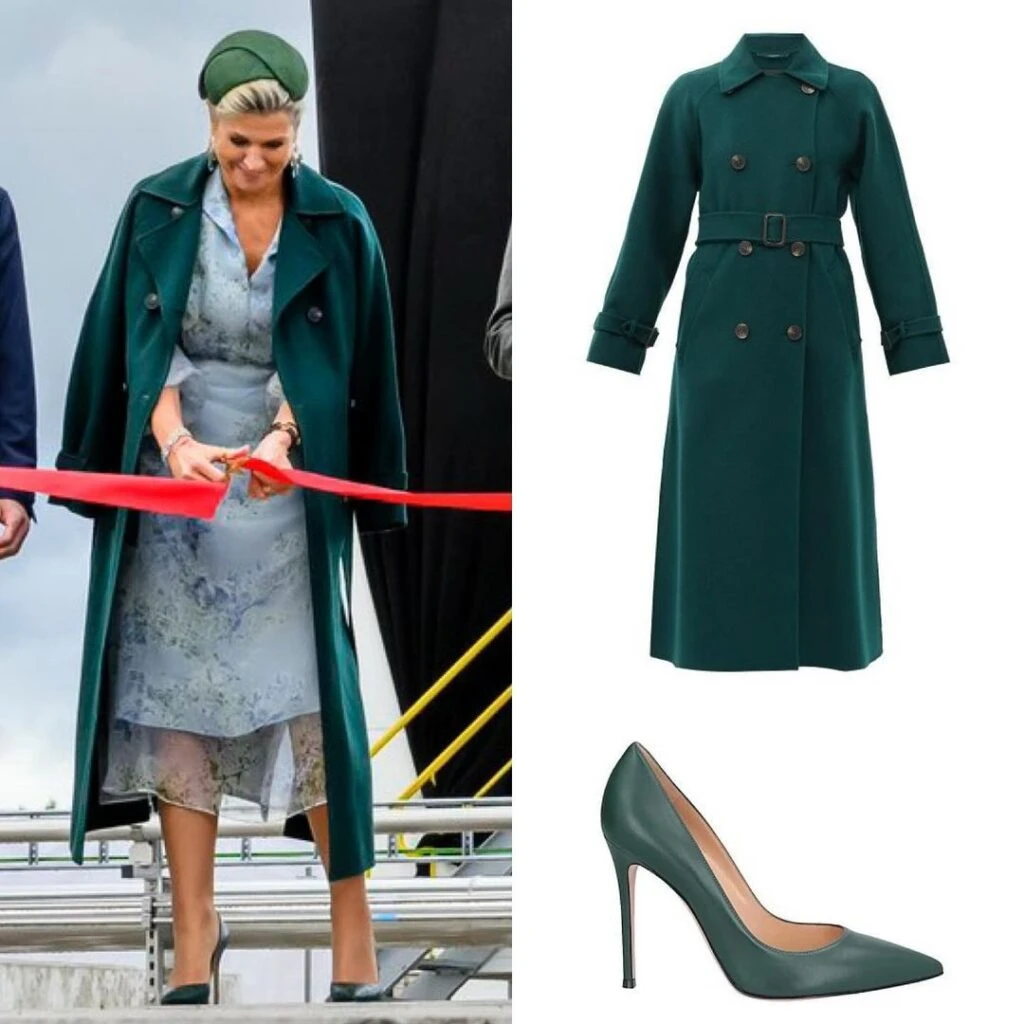 Este posee detalles de hojas verdes que Máxima supo aprovechar para complementar su look. A esto, le sumó unos zapatos de su firma de cabecera, Gianvito Rossi, en tono verde oscuro, y un tocado haciendo juego.