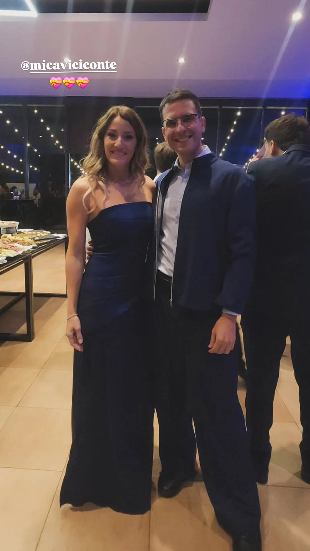 Para la celebración, Mica eligió un vestido largo en color azul marino, de corte sirena, strapless y al cuerpo hasta la cadera, que luego se abría en una falda levemente evasé con aberturas laterales. Un diseño que destacó su figura y aportó elegancia con un toque sensual.