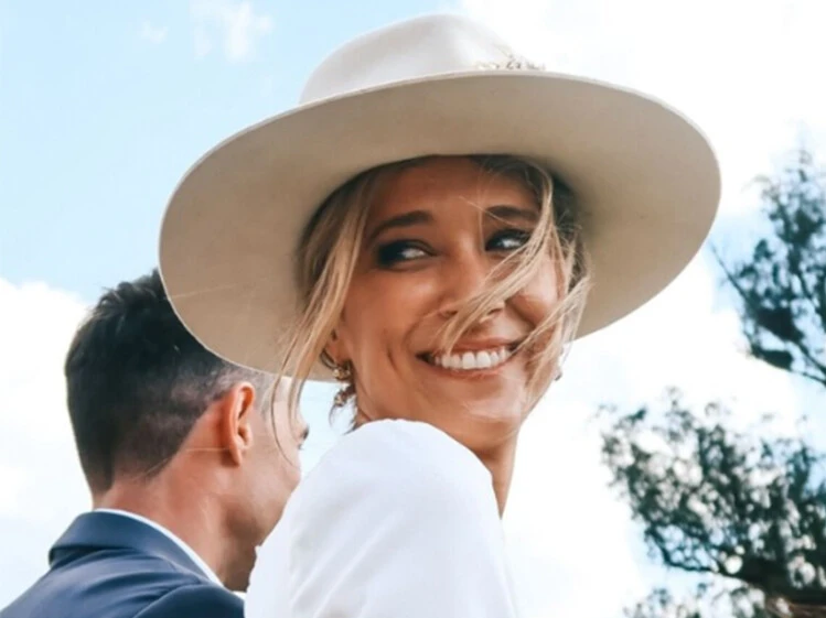El complemento estrella fue el sombrero de ala ancha en tono crudo, una elección que reemplazó al velo tradicional y le dio al look un aire bohemio y refinado a la vez. Su peinado —un recogido bajo y prolijo— permitió destacar la espalda y mantener el equilibrio entre frescura y elegancia.