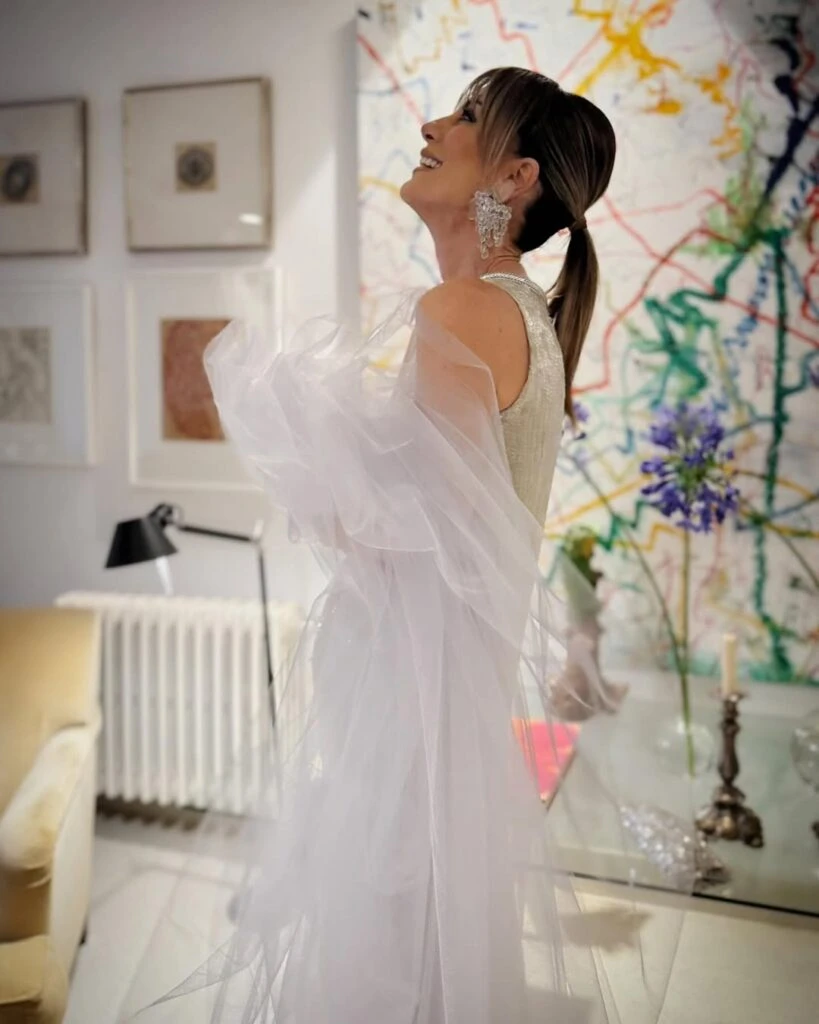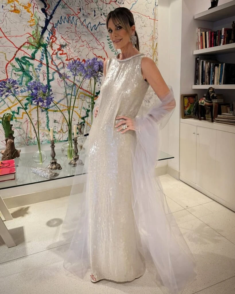 La modelo llevó una pieza de Adrián Brown con detalles de brillos y sin mangas, que combinó con un clutch vintage. Además, combinó con un accesorio de tul, unos zapatos de taco en color plata y varios accesorios en el mismo color.