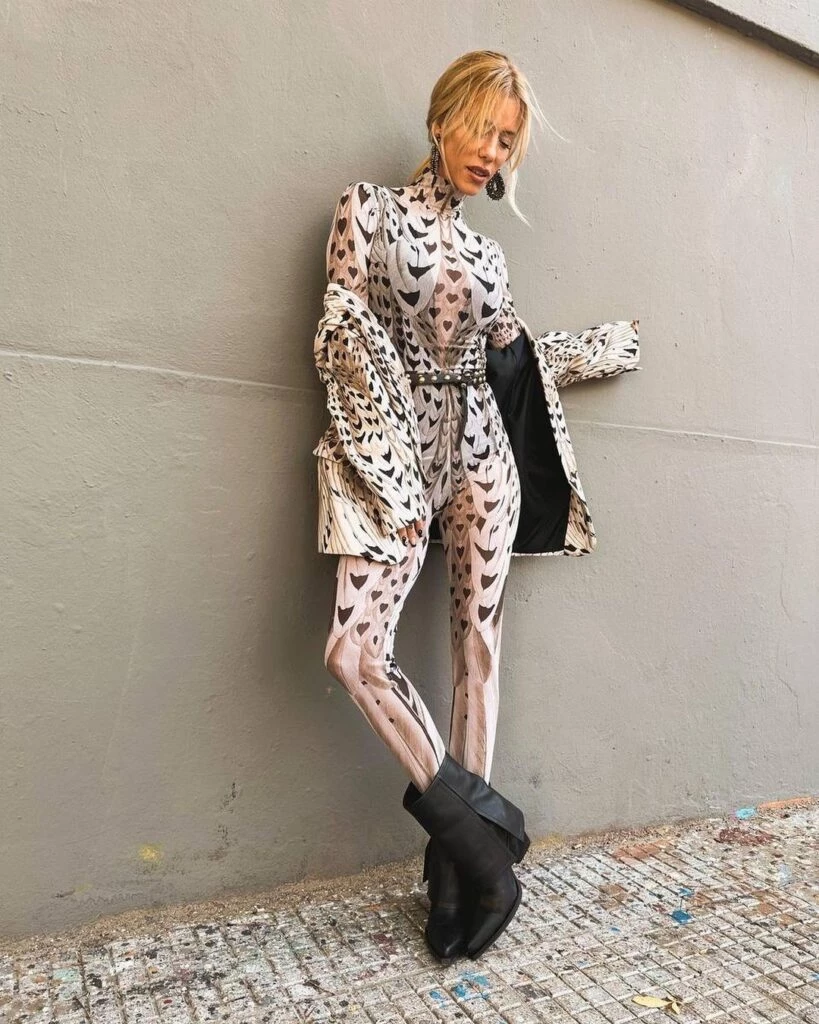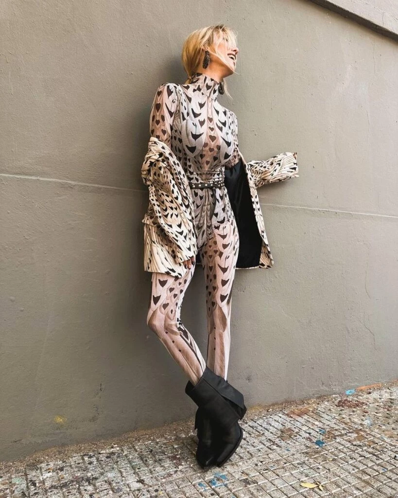 Así, Nicole Neumann volvió a tomar esta prenda, que fue furor en la primavera-verano 2022, para lograr un look increíble. La modelo y madre de Sienna, Allegra e Indiana llevó para su presencia en "Los 8 escalones", un catsuit semitranparente y estampado con figuras abstractas.