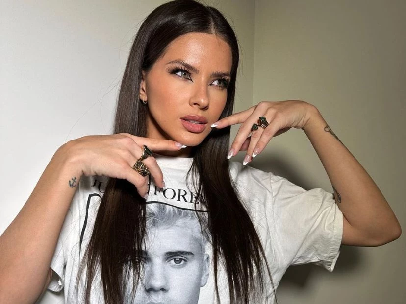 Pero lo más destacado fue el look elegido: una remera estampada con la foto de Justin Bieber, pantalones engomados negros, botas cortas de cuero del mismo tono y guantes también engomados, que artistas como Emilia Mernes o Tini Stoessel lograron popularizar y hacer tendencia.