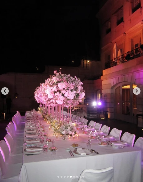La celebración se realizó en los jardines del Palacio bajo la luz de la luna. En cuanto a la decoración se ubicó una gran mesa rectangular con centros de mesa elevados llenos de flores rosas y blancas.