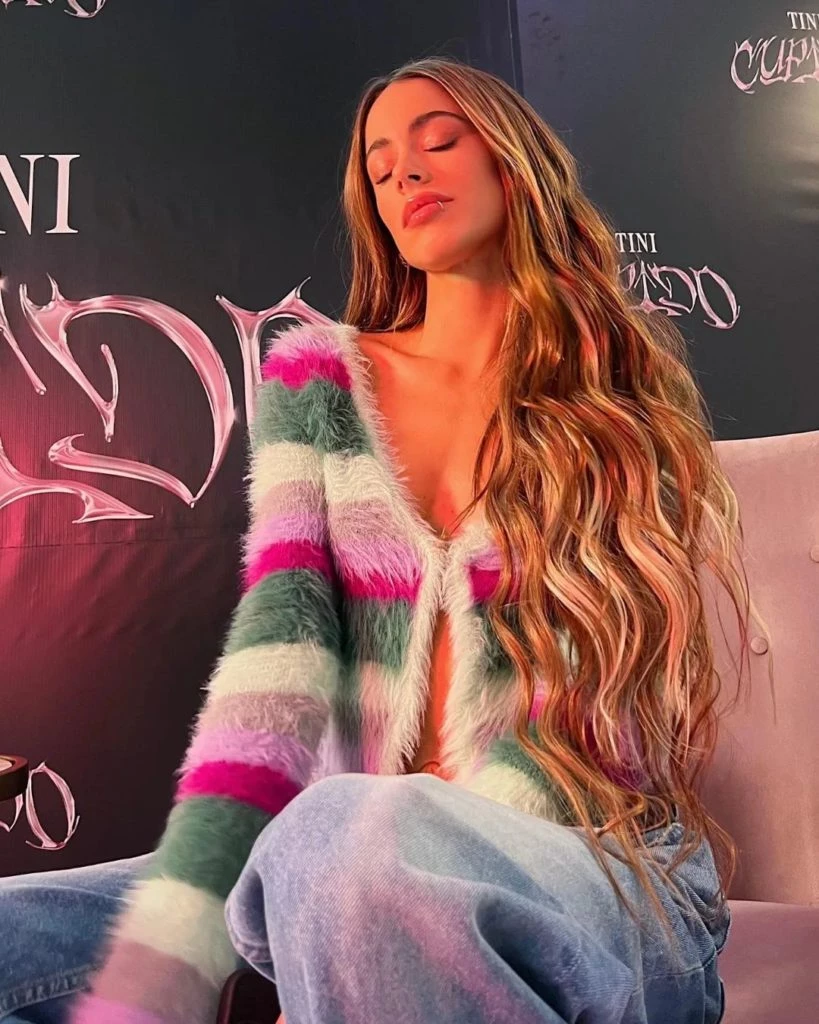 Para celebrar este lanzamiento, la novia de Rodrigo de Paul eligió un outfit noventoso y con muchos colores, para ir en sintonía con esta fecha especial. En esta oportunidad, Tini eligió un cárdigan de punto esponjoso. Este tiene cuello en V, mangas largas, y un llamativo estampado de rayas multicolores.