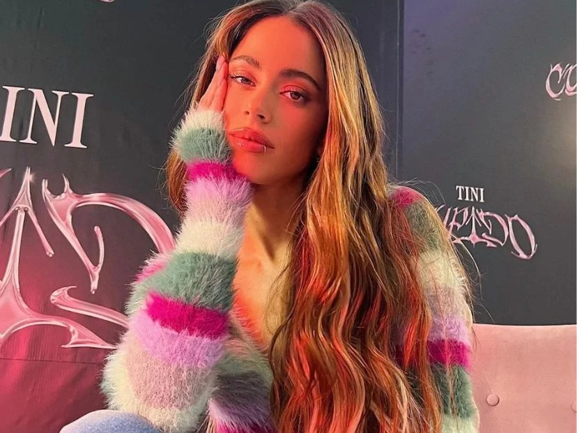 Para celebrar este lanzamiento, la novia de Rodrigo de Paul eligió un outfit noventoso y con muchos colores, para ir en sintonía con esta fecha especial. En esta oportunidad, Tini eligió un cárdigan de punto esponjoso. Este tiene cuello en V, mangas largas, y un llamativo estampado de rayas multicolores.