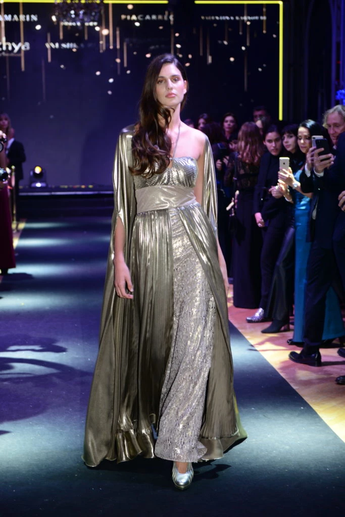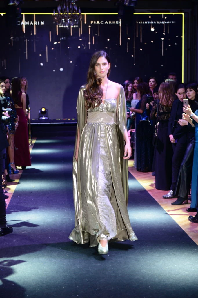 Suami Delelis adelantó una prenda de su próxima colección de verano en el Desfile de los Diseñados en la Gala Para Ti 100 Años. "Es un vestido de escote pirámide con tirantes halter, el corsage íntegramente alforzado en nervaduras y el espadín central mini tableado, de estilo fourreau en gasa jaquard de seda en tonos metalizados dorados y nude, con sobre falda en gasa plisada metalizada color bronce y capa en la misma tela", detalló.