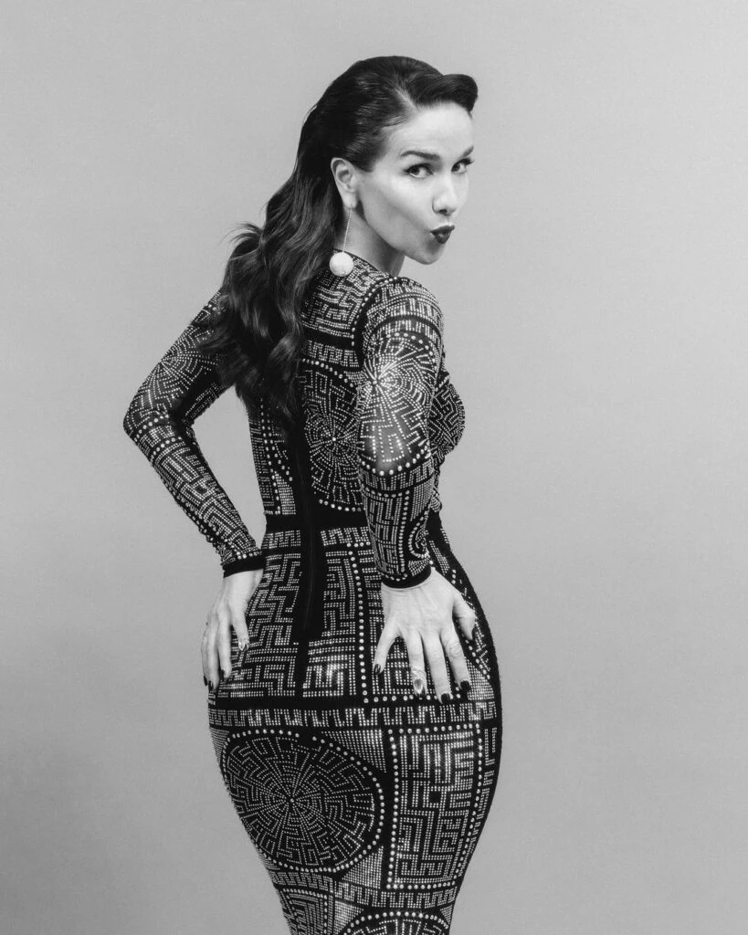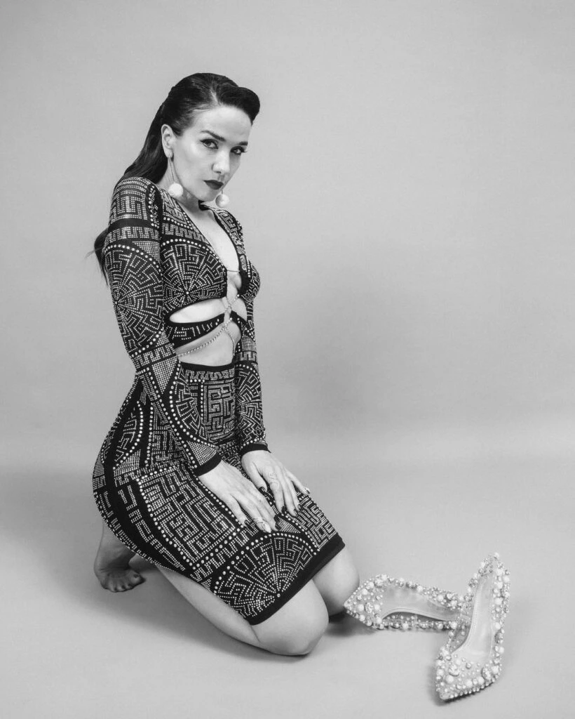 Además, marca la figura de la cantante dándole mucha sensualidad y glamour. Acompañó este look, con unos originales zapatos cubiertos de perlas, siguiendo con el mismo estilo del outfit. En cuanto a su peinado, optó por usarlo semirecogido, con mucho gel y flequillo hacia el costado, con cierto volumen, con una onda pin up.