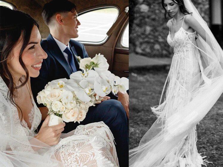 Sol deslumbró con un vestido blanco de la marca española Yolancris, de estilo lencero y corte romántico, confeccionado en encaje y tul y con detalles de flecos en la falda y cola. El diseño combinó sofisticación y modernidad, resaltando su figura y su estilo personal.