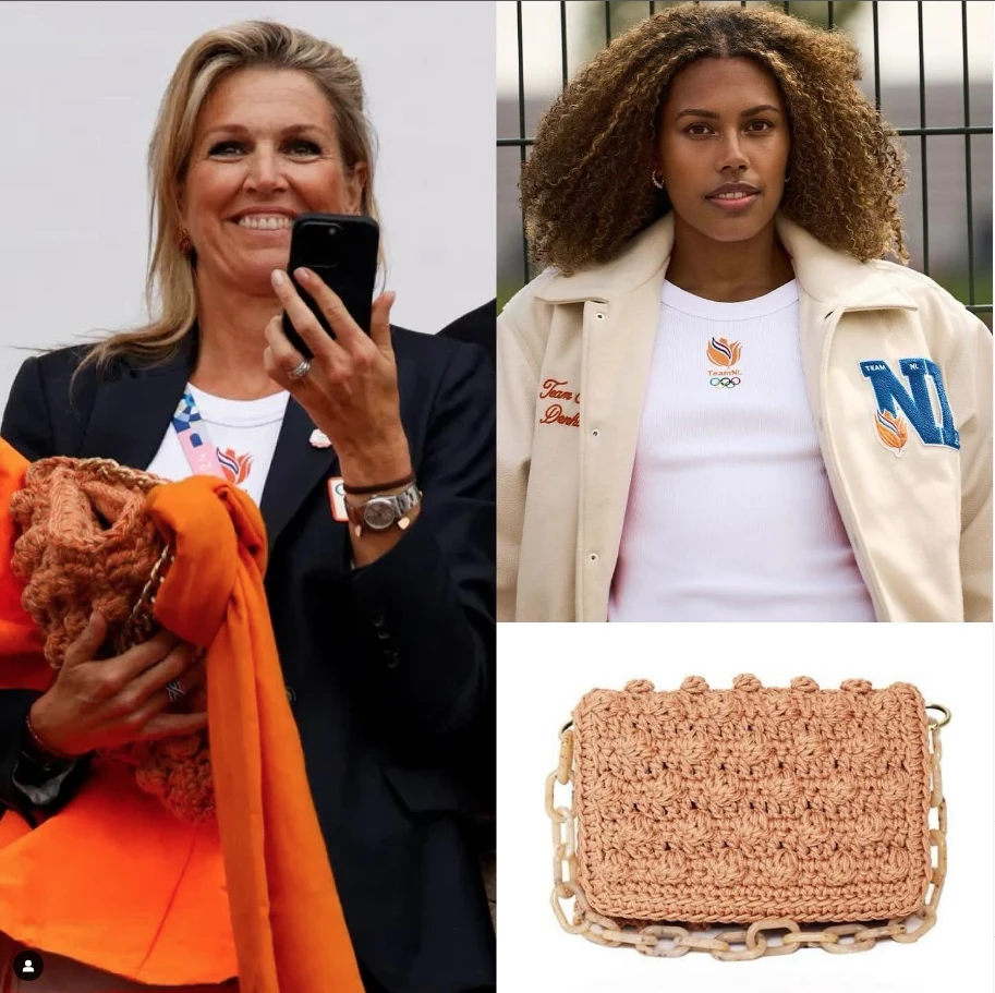 La reina completó su estilismo con una cartera tejida al crochet en tono marrón, con cadena rústica, de la marca One & Only.