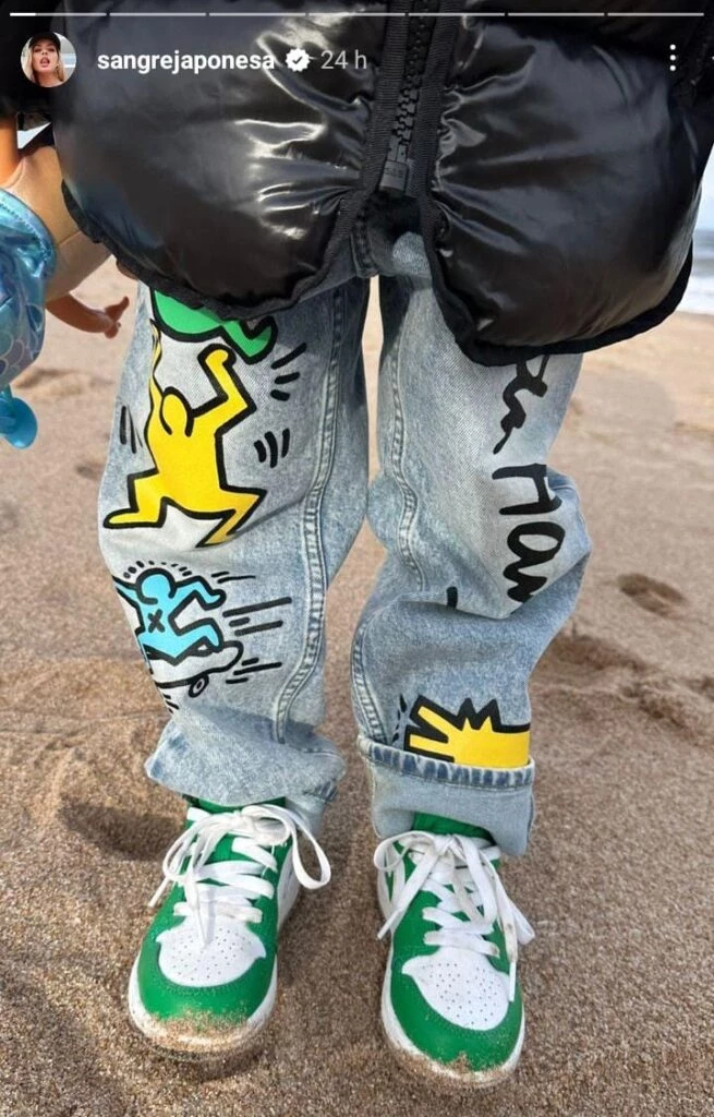 En las imágenes se puede ver a la niña luciendo una chaqueta de tipo universitaria bordada, muy de moda entre los más jóvenes, una campera puffer negra (súper ideal para estos climas fríos y ventosos), un jean azul con coloridos dibujos estampados, y zapatillas deportivas en verde y blanco de una reconocida marca de calzado.