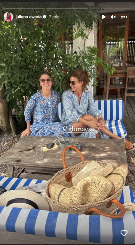 Juliana se mostró en una foto con su amiga Gloria Confalonieri. Muy divertida, mostró su look que consistió una túnica larga con estampa de arabescos en celeste y blanco y lo combinó con accesorios que completan su outfit a la perfección. Un sombrero y un bolso o canasto de fibra, sandalias chatas de color suela y anteojos de sol con marco de carey.
