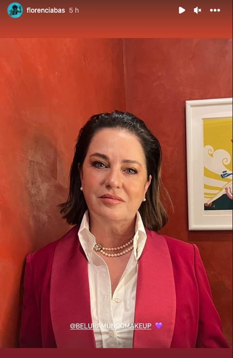 En cuanto al look, Florencia Bas causó alto impacto llevando un smoking de color rojo con pantalón ancho y saco con solapa de satén, todo de la diseñadora Cynthia Martos. Y completó su destacado outfit con una camisa blanca y collar de perlas de dos vueltas con broche de strass y delicados aros en juego.