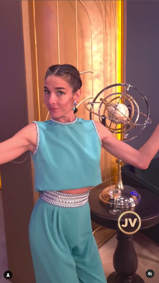 Con una leve inspiración en el outfit de la princesa Jazmín -de la película "Aladdin" de Disney-, el estilismo de Juana consistía en un crop top y pantalón tipo palazzo. El top tenía espalda abierta y detalle de apliques de galones metalizados en cuello y mangas.