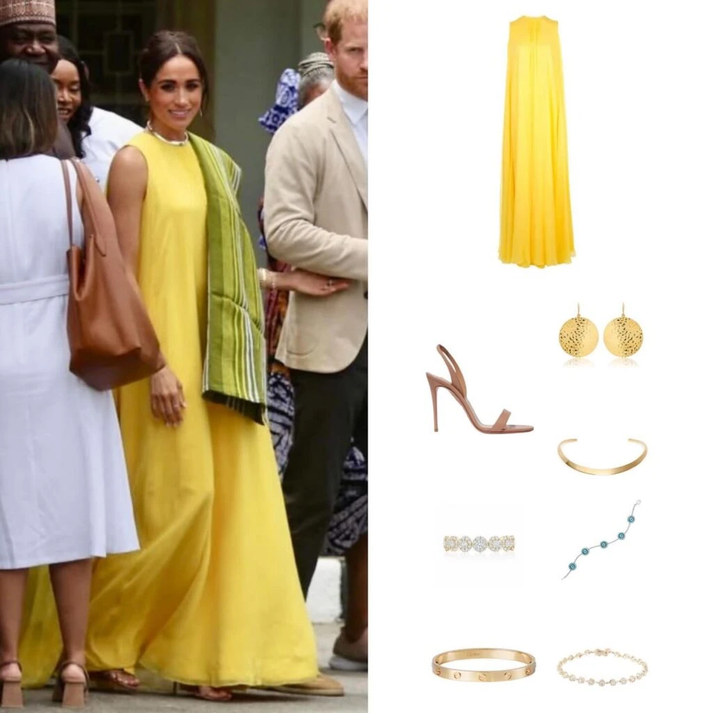 Para esta cita de cultura Meghan adoptó un vestido largo de gasa de color amarillo que rescató de su guardarropas.