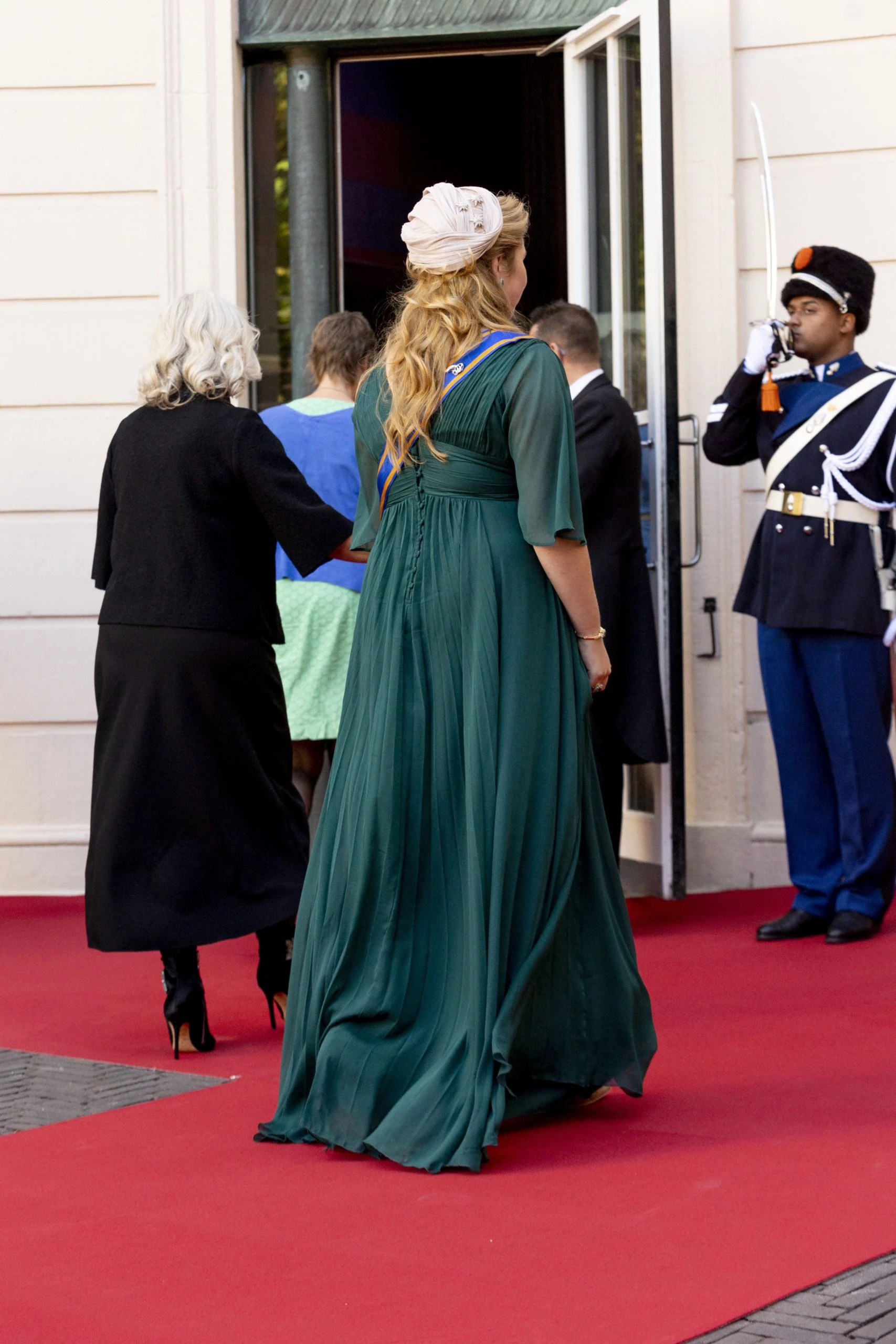 Con el asesoramiento de su estilista, Rick Evers (quien también está detrás de los looks de Máxima) eligió un vestido de gasa en color verde botella de Asos con manga tipo murciélago, un tocado en color claro de Maison Fabienne Delvigne, la prestigiosa firma belga. Y, finalmente, una cartera de mano de predería Anna Cecere, que complementó con guantes y zapatos en color natural.