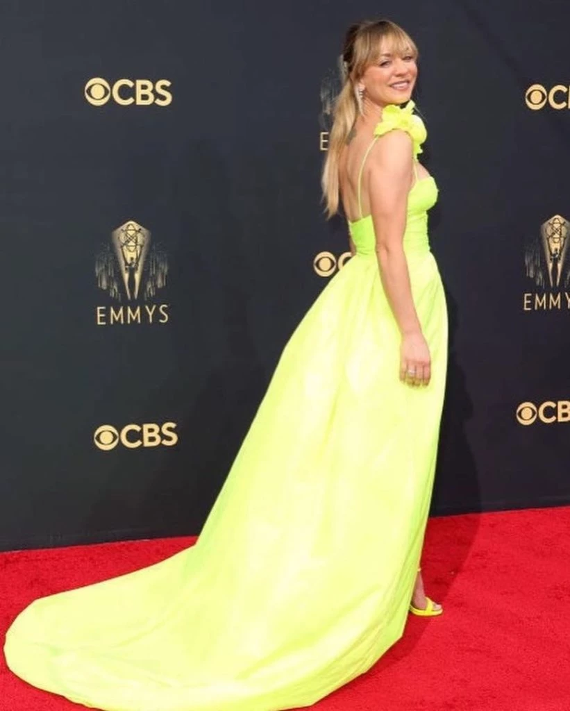 Kaley Cuoco fue una de las que se animó al amarillo neón en este diseño de Vera Wang, con sandalias al tono.