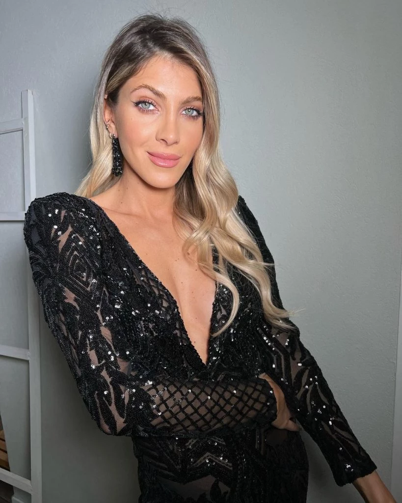 Ruggeri eligió un elegante mono negro con lentejuelas y un pronunciado escote, diseño de Márian Saud. Acompañó su outfit con unos zapatos de taco negros y accesorios a tono. El peinado estuvo a cargo de Vangart Peluquería y el make up, fue realizado por la maquilladora Agus Caparra.