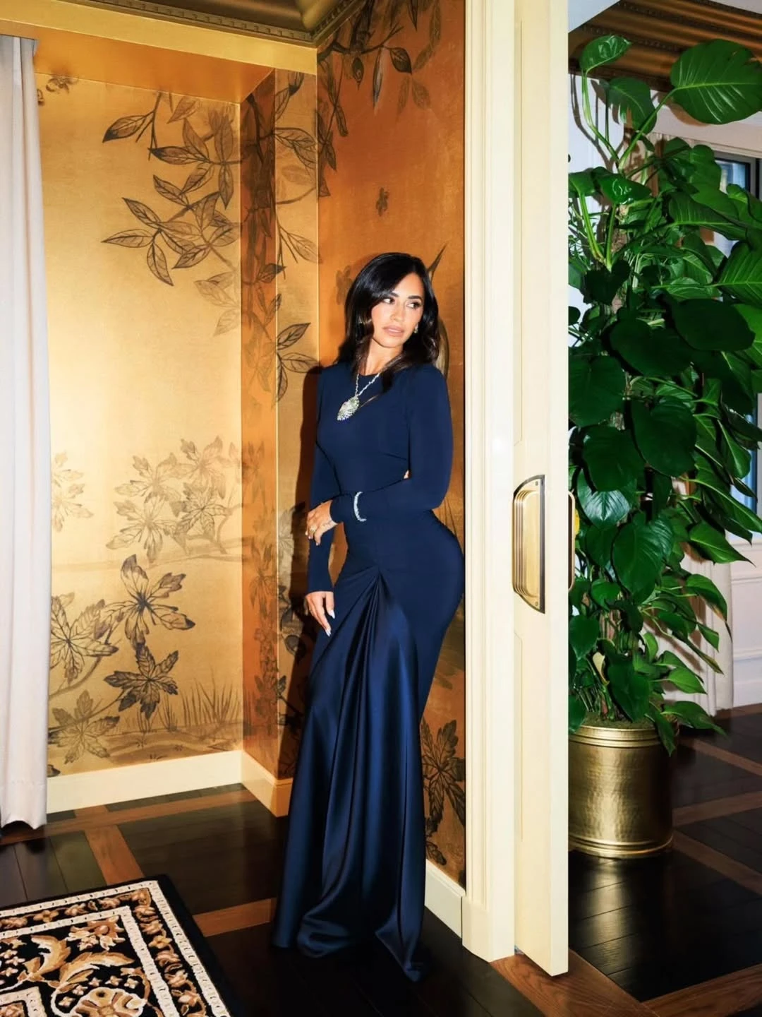 La tela, con leve acabado satinado, aportaba brillo sutil y movimiento, mientras que el escote cerrado reforzaba ese equilibrio entre sobriedad y sensualidad que Antonela maneja a la perfección. Acompañó con joyería de Tiffany que le dieron el toque al look: una cadena con un gran dije y pulseras a juego.