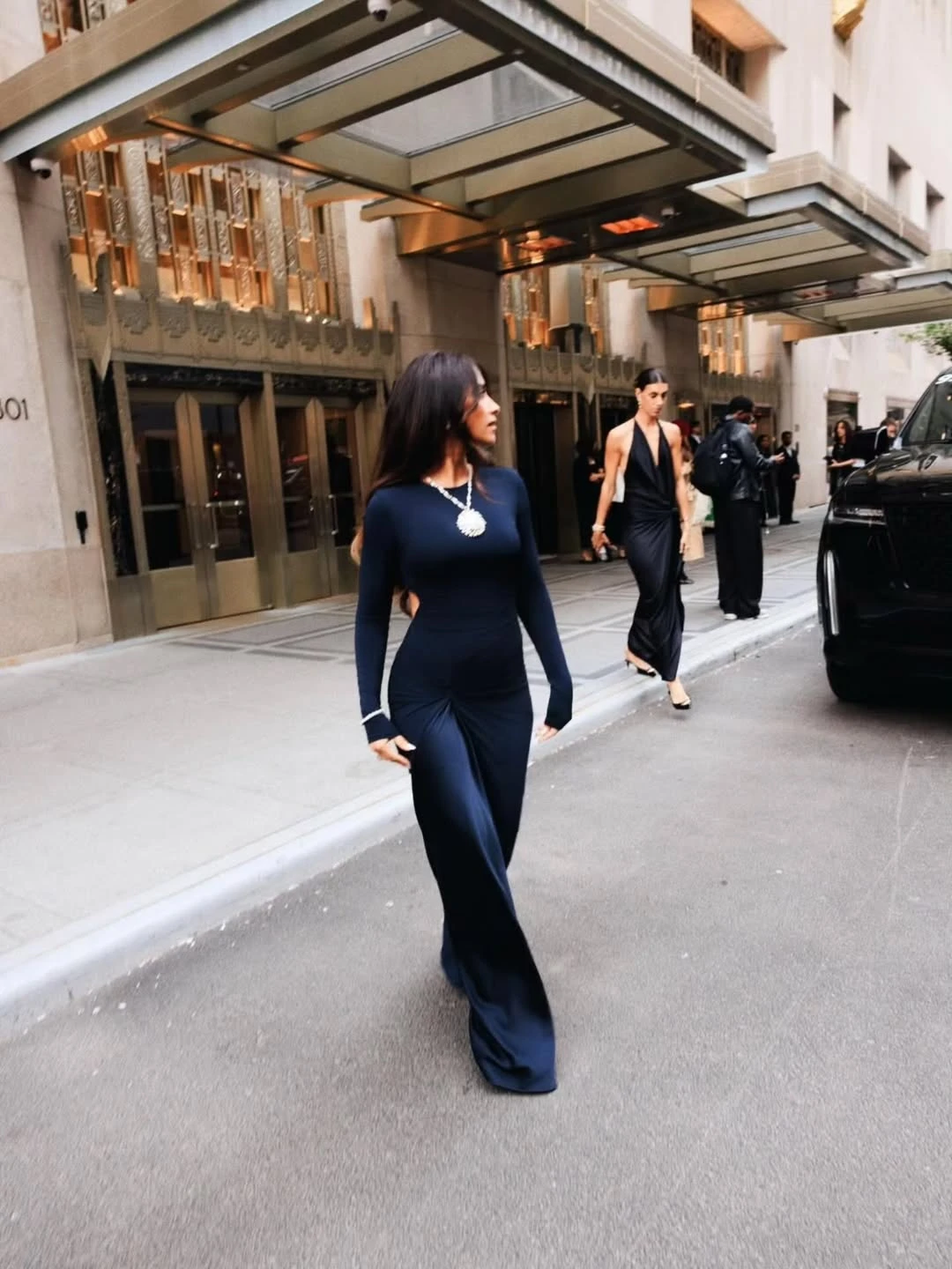 La rosarina apostó por un vestido largo en azul noche de silueta ceñida, mangas largas y líneas limpias, con caída fluida hasta el piso. Este poseía una abertura en la zona de la espalda, lo que le dio un giro sofisticado y sexy. Además, marcaba su figura elevando sus curvas de una manera sensual pero elegante.