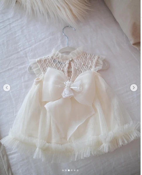 Para esta ocasión, Olivia se vistió con un soñado vestido de color blanco. En concreto se trató de un vestido de gasa, sin mangas y con terminación de volados. Además contaba con un canesú en punto smock bordado con mini perlas.