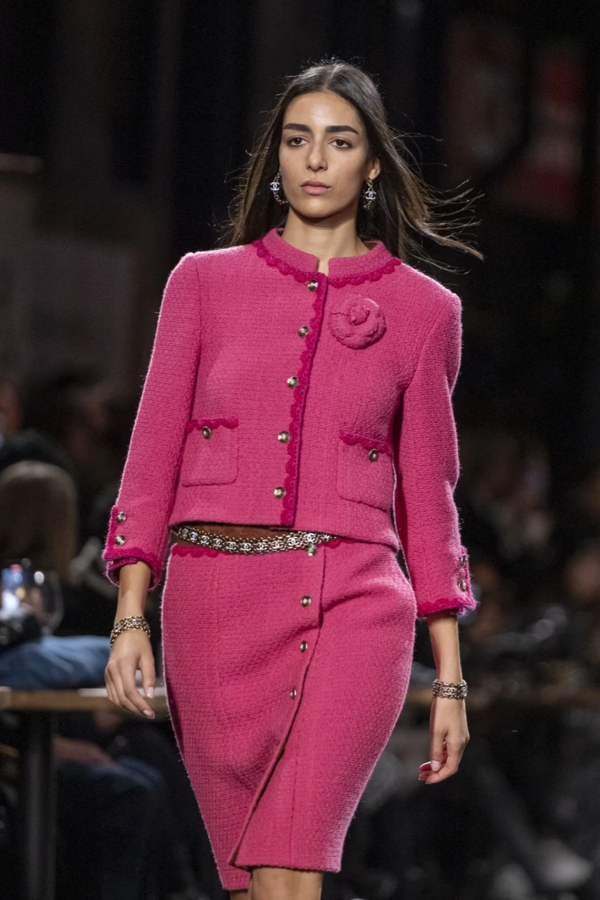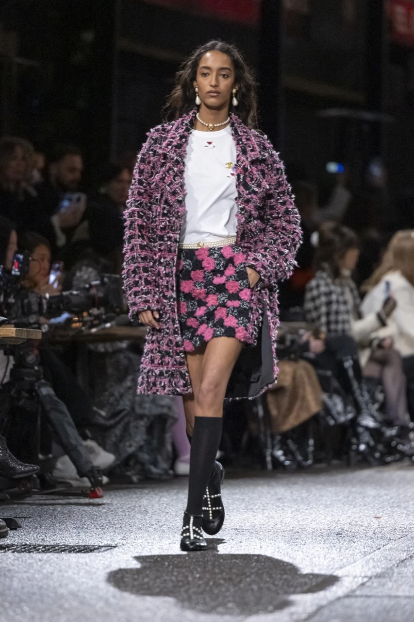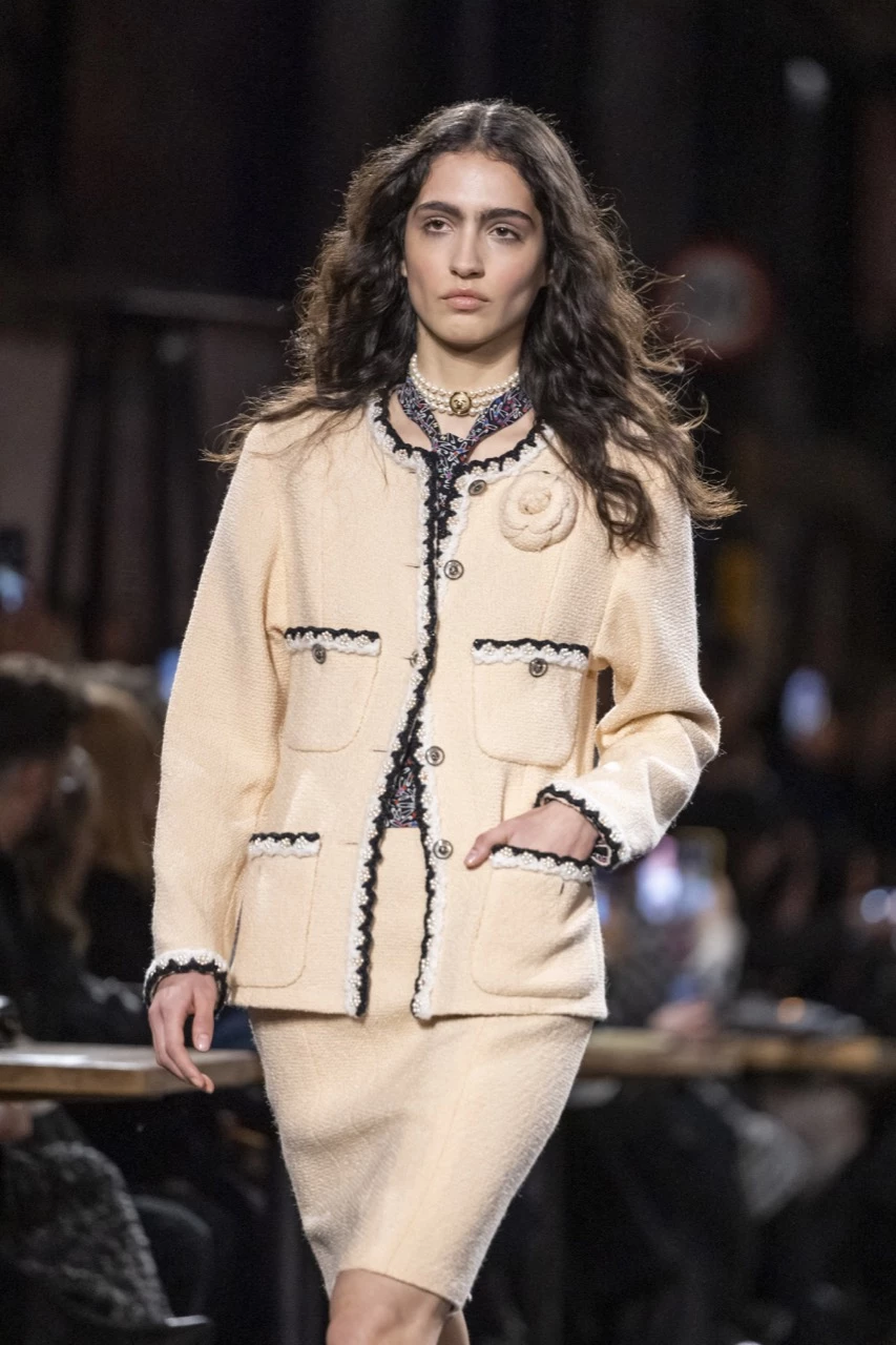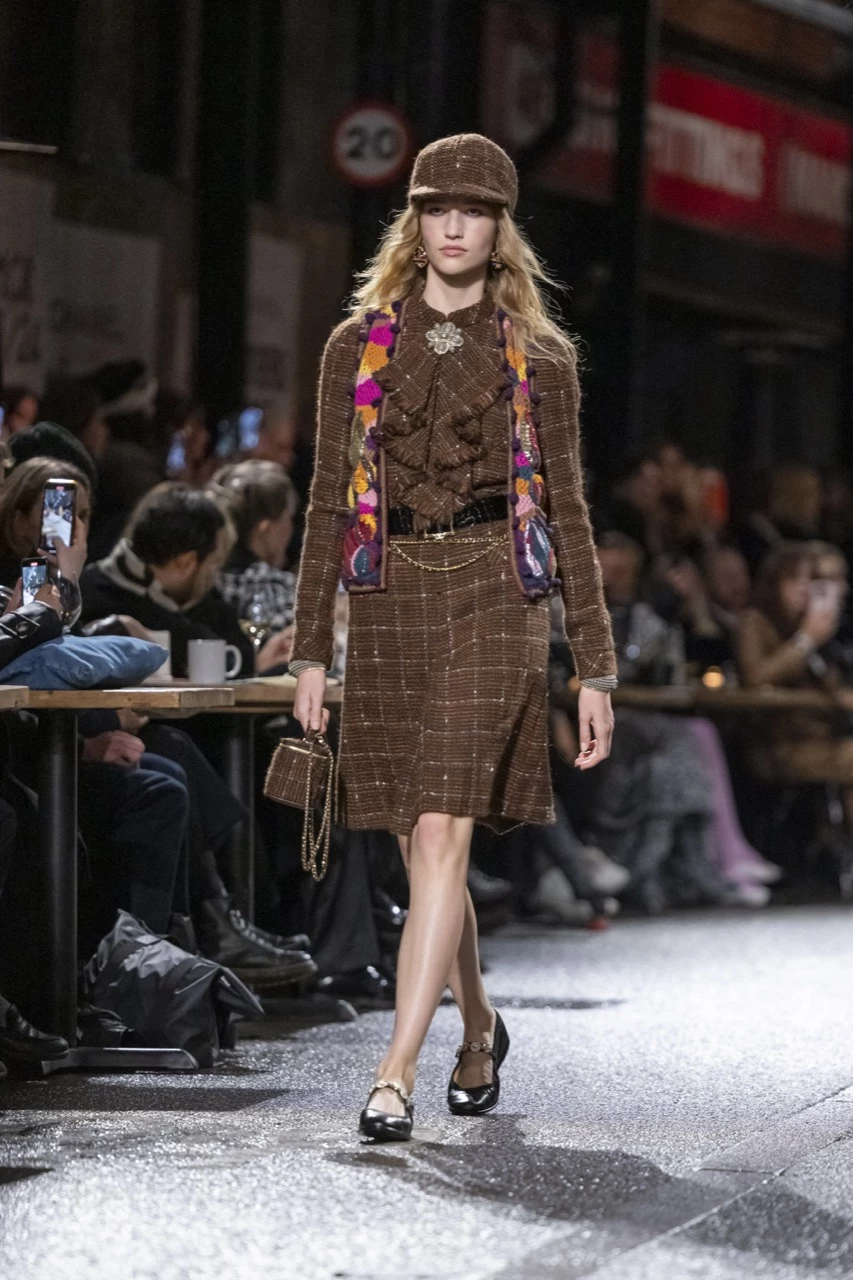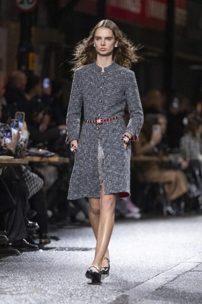 Se cree que Coco Chanel se enamoró de los tweeds diseñados en Inglaterra durante su época romántica con el duque de Westminster. En el desfile, el tweed se repitió en trajes, faldas, abrigos con bolsillos de parche, minivestidos, camisas y chaquetas. Las prendas se adornan con plumas, bordados y cadenas, un clásico de Chanel.