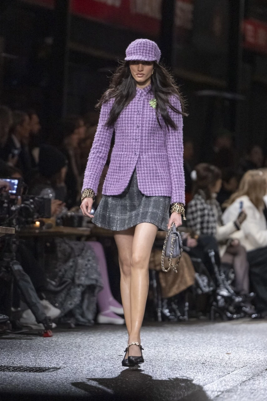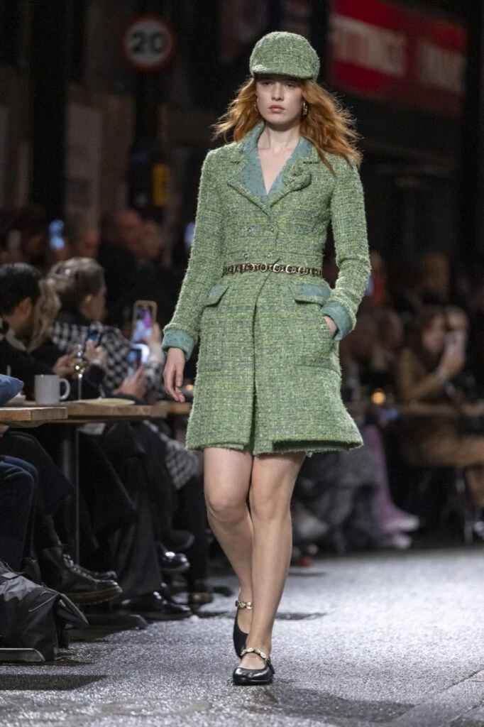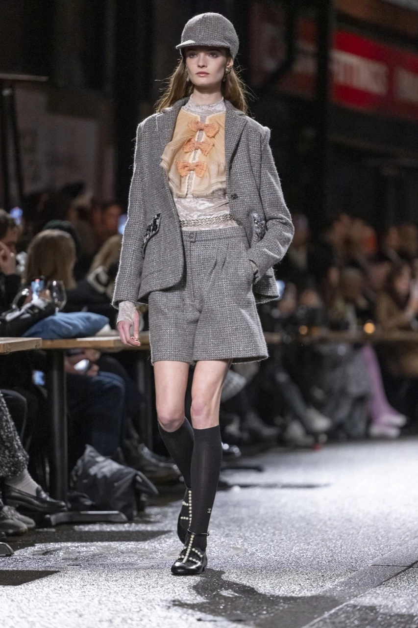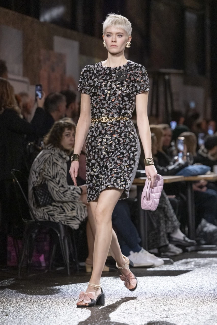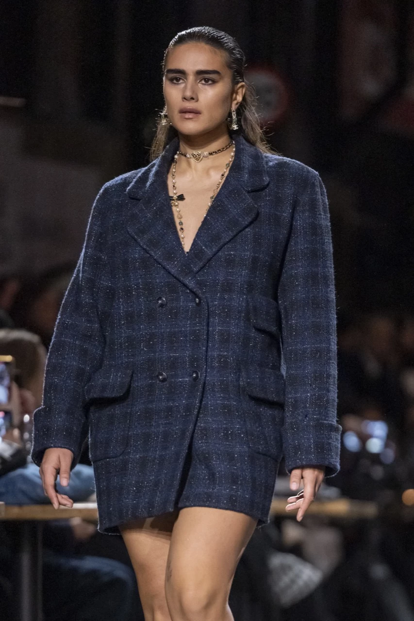 Se cree que Coco Chanel se enamoró de los tweeds diseñados en Inglaterra durante su época romántica con el duque de Westminster. En el desfile, el tweed se repitió en trajes, faldas, abrigos con bolsillos de parche, minivestidos, camisas y chaquetas. Las prendas se adornan con plumas, bordados y cadenas, un clásico de Chanel.