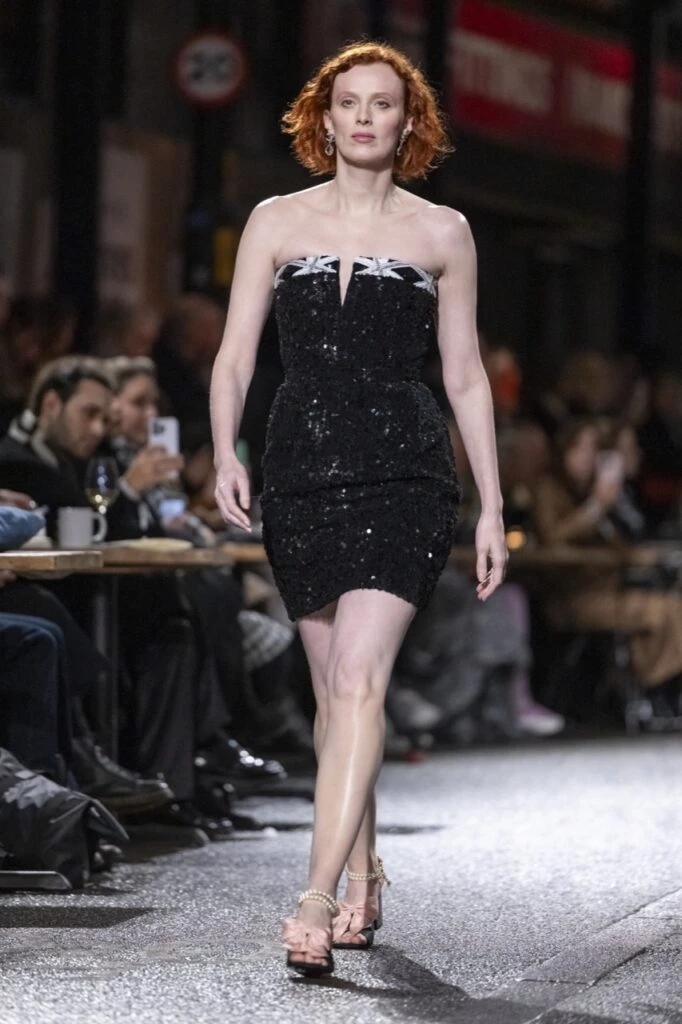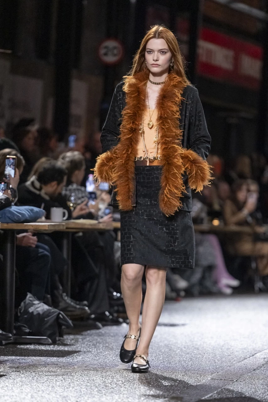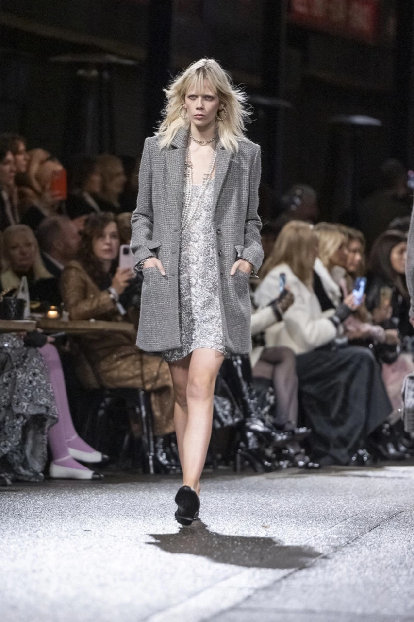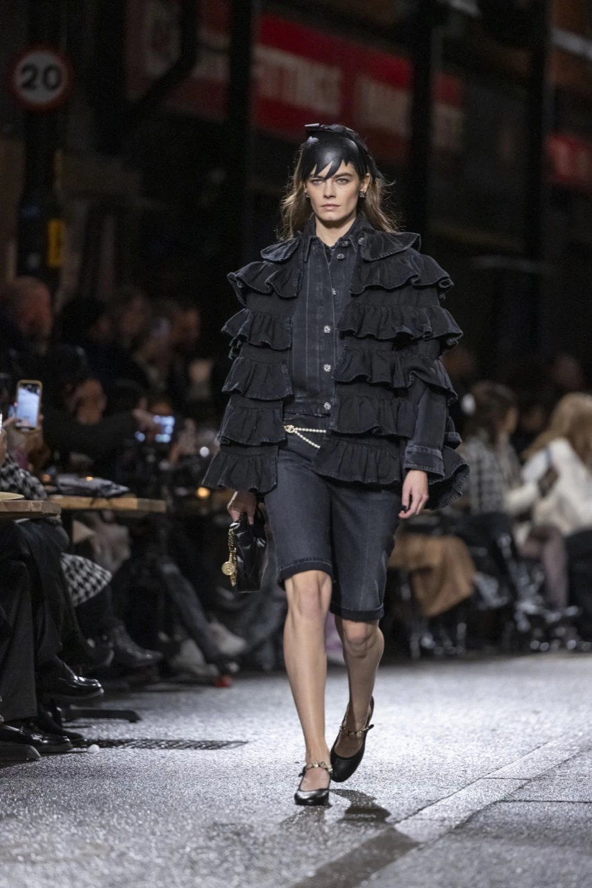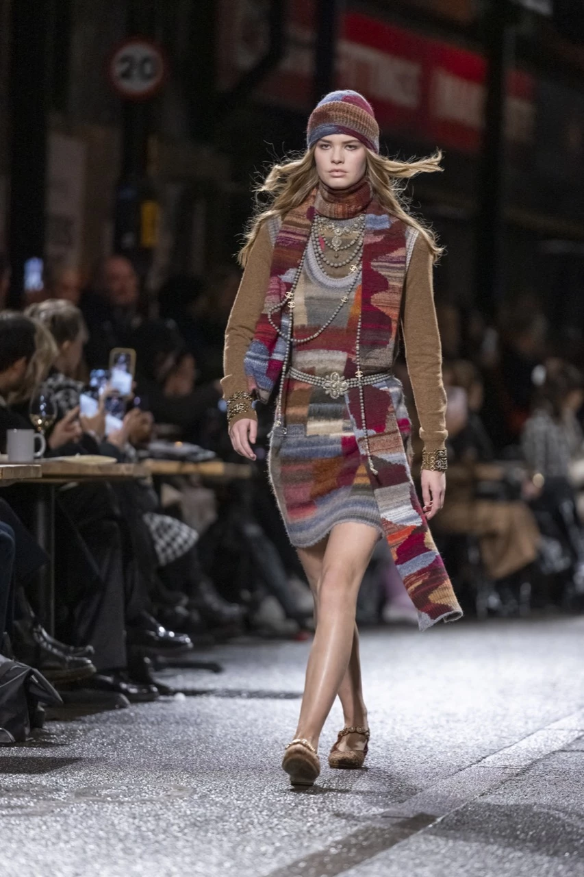 Se cree que Coco Chanel se enamoró de los tweeds diseñados en Inglaterra durante su época romántica con el duque de Westminster. En el desfile, el tweed se repitió en trajes, faldas, abrigos con bolsillos de parche, minivestidos, camisas y chaquetas. Las prendas se adornan con plumas, bordados y cadenas, un clásico de Chanel.