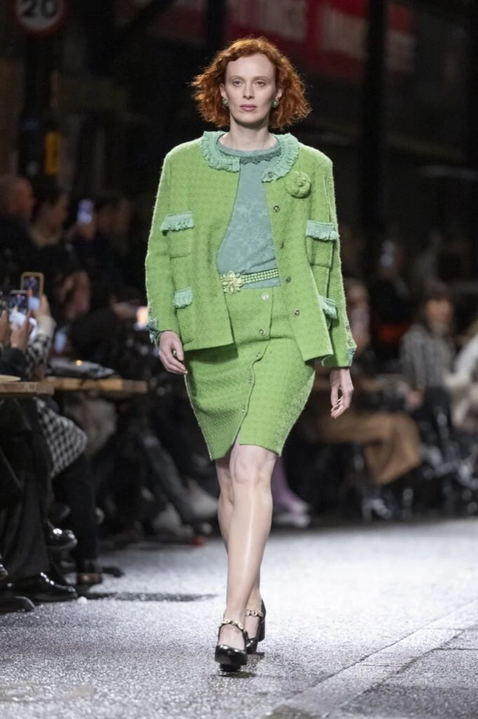 Los trajes de tweed se presentan en rosa, amarillo limón y verde manzana. Los cortes son ajustados y la cintura de las faldas se lleva ligeramente baja en las caderas.