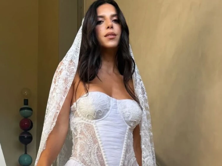 El diseño apostó por una estética contemporánea y se alejó de los estilos más tradicionales. La pieza tenía un corset estructurado strapless, que definía la figura y resaltaba la cintura, mientras que la falda incorporaba transparencias con delicados bordados, aportando textura y movimiento. El resultado fue un estilismo elegante pero con un toque audaz, ideal para una boda en la naturaleza.