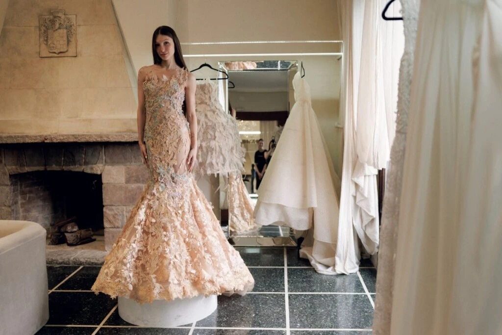El busto se convierte en el punto focal del diseño, con bordados que se desprenden de forma escultórica y se degradan hacia una falda amplia con cola estructurada. La espalda, de corte profundo, se cierra con un cruce infinito de lazos de gasa de seda que culmina en un gran moño, aportando dramatismo y romanticismo al look.
