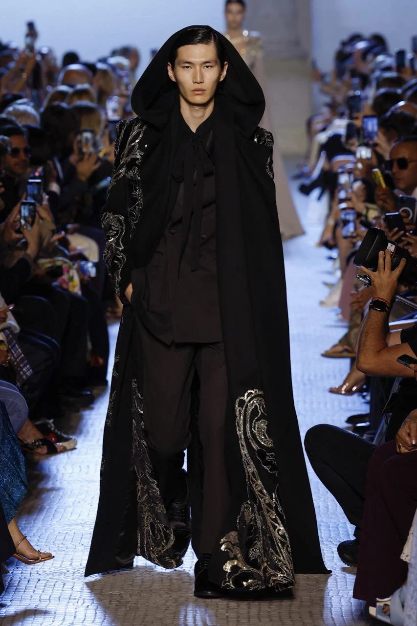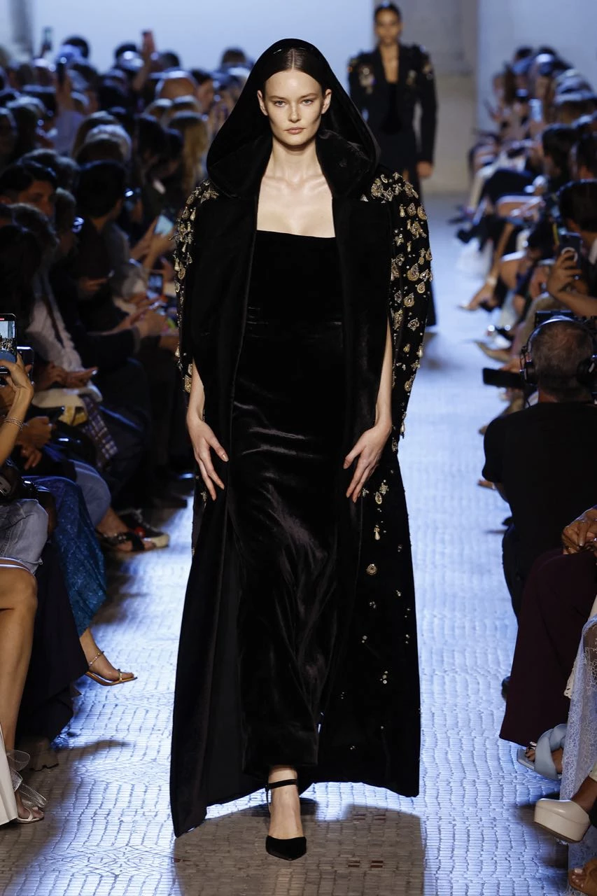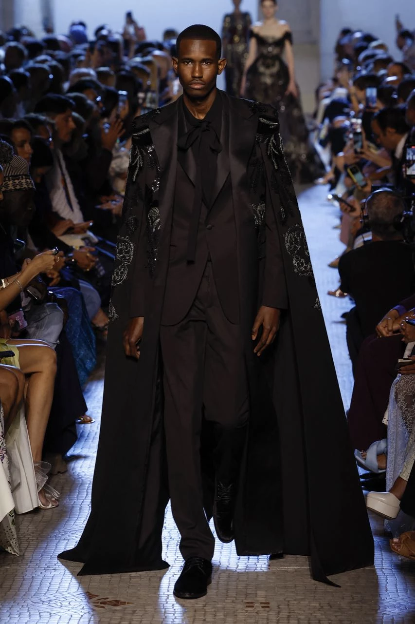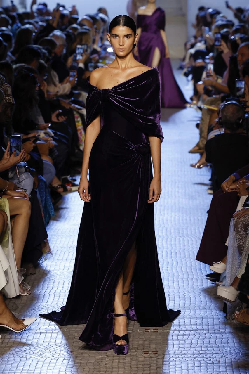 “Adoro el glamour de antaño, la majestuosidad de las reinas”, comentó Saab. Un vestido rosa de tul con escote cubierto de pétalos de seda recordó a Kiera Knightly en La duquesa; un vestido de terciopelo negro con hombros descubiertos a Charlize Theron en Blancanieves y el cazador, y un esmoquin y una capa con cristal, a Angelina Jolie en Maléfica.