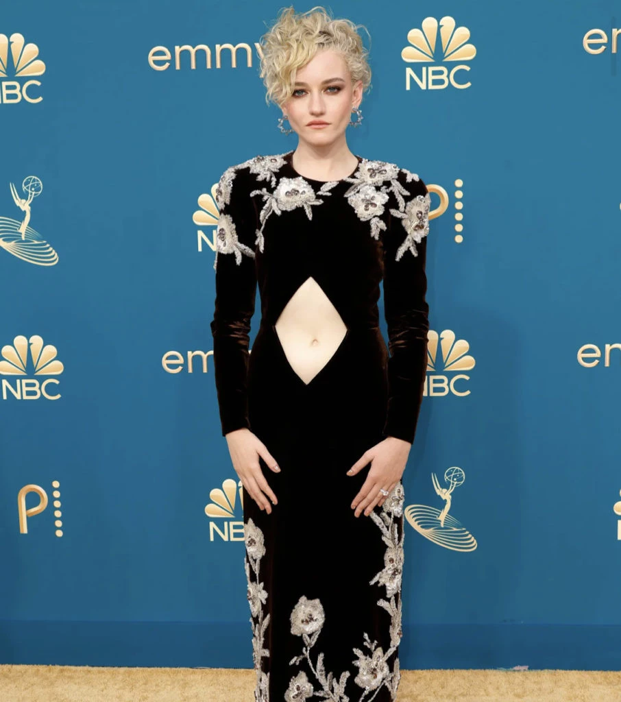 Julia Garner lució un diseño de Gucci de terciopelo y bordados. Combinó con aros Swarovski.