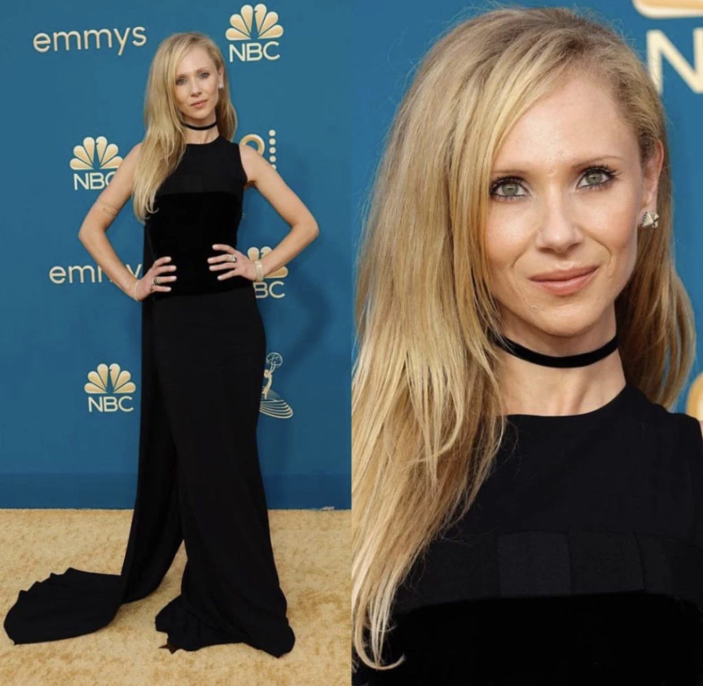La actriz Kate McKinnon un traje total black de Brioni y joyería de Cicada.