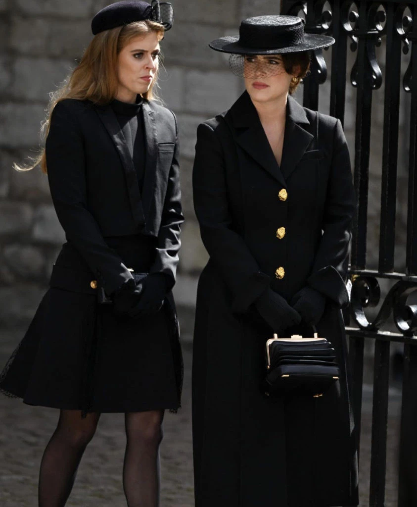 Las nietas de la Reina Isabel II fueron junto a su madre, Sarah Ferguson, al funeral de su abuela. Beatriz lució un blazer , con falda corta con detalles de encaje. Eugenia un tapado largo con botones dorados XL muy sofisticado.