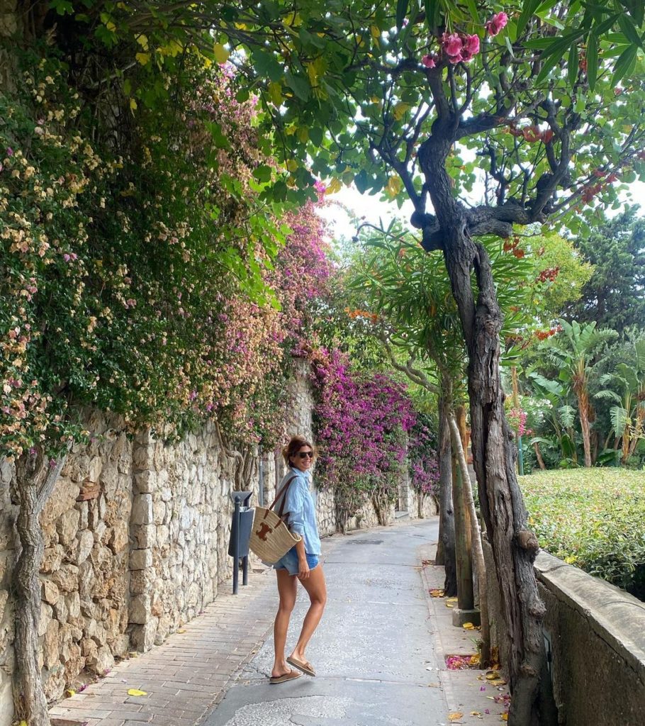 Para pasear por la isla de Capri, Italia, eligió combinar los shorts con una camisa de lino celeste, una canasta y unas sandalias planas en color marrón. ¡Una fórmula que nunca falla!