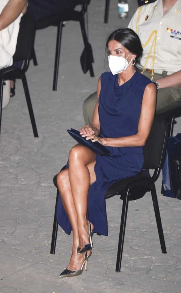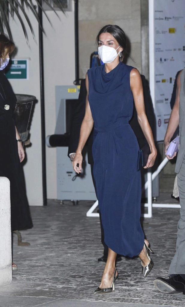 Letizia se mostró impecable con la elección de su look en color azul marino. Adoptó un conjunto de seda de top sin mangas drapeado y con detalle de pliegue en el hombro, y lo combinó con una pollera de largo midi , con sensual abertura que deja sus piernas al descubierto.