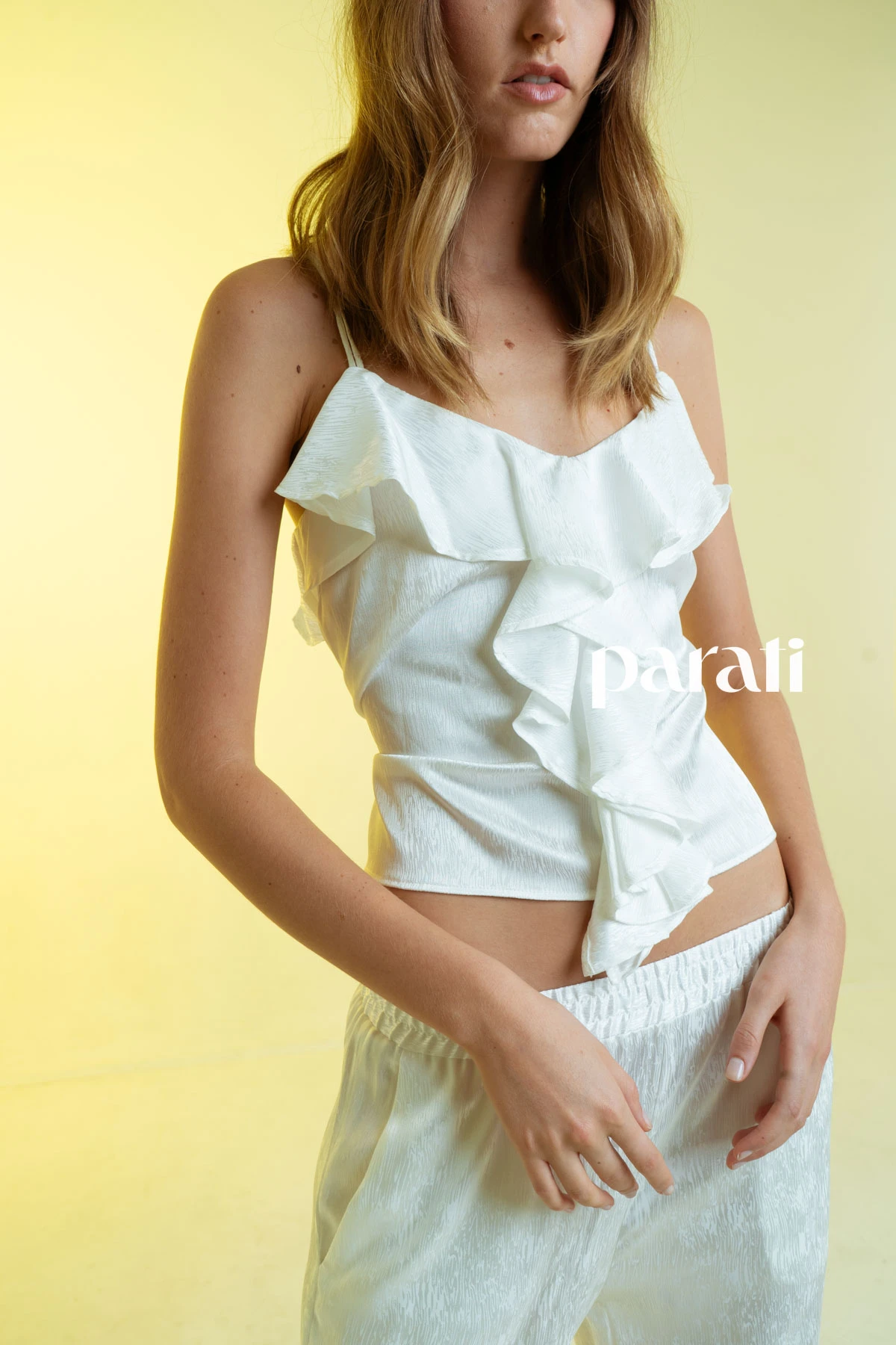 Top con volados y pantalón ancho de satén labrado @mirtaarmestook.