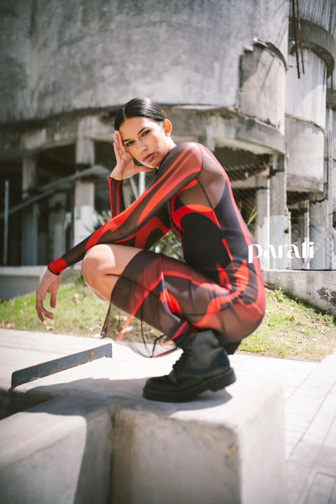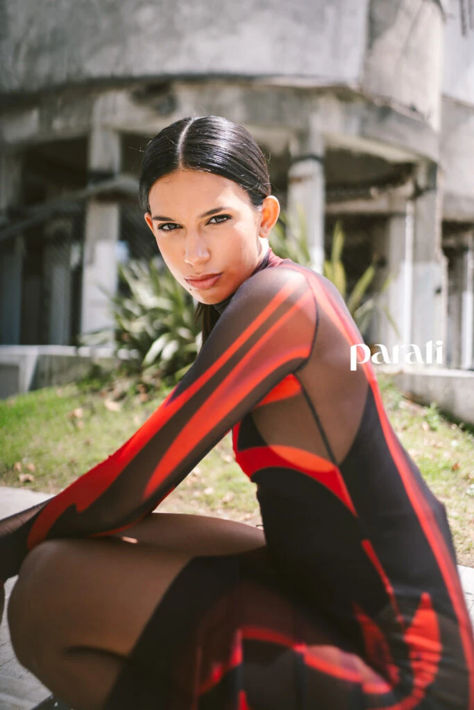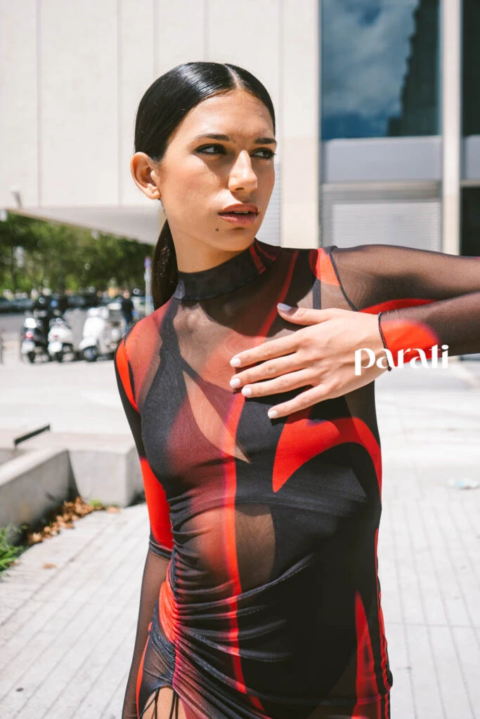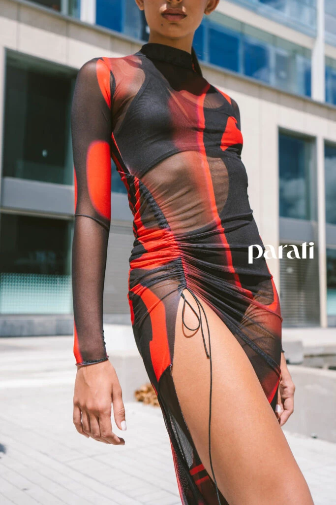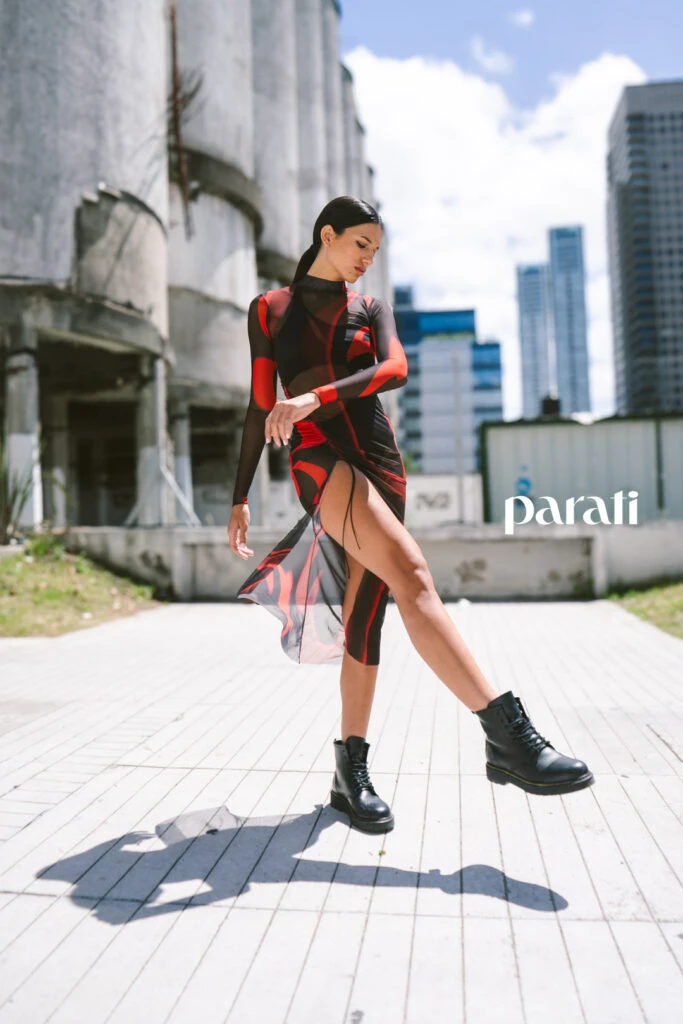 Espectacular vestido negro y rojo de microtul con frunce, manga larga y tajo, que se lleva con body elastizado con cruces (Rica, @rica.com.ar). Borceguíes de cuero ecológico (Make Arg, @makearg).