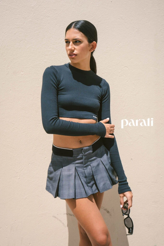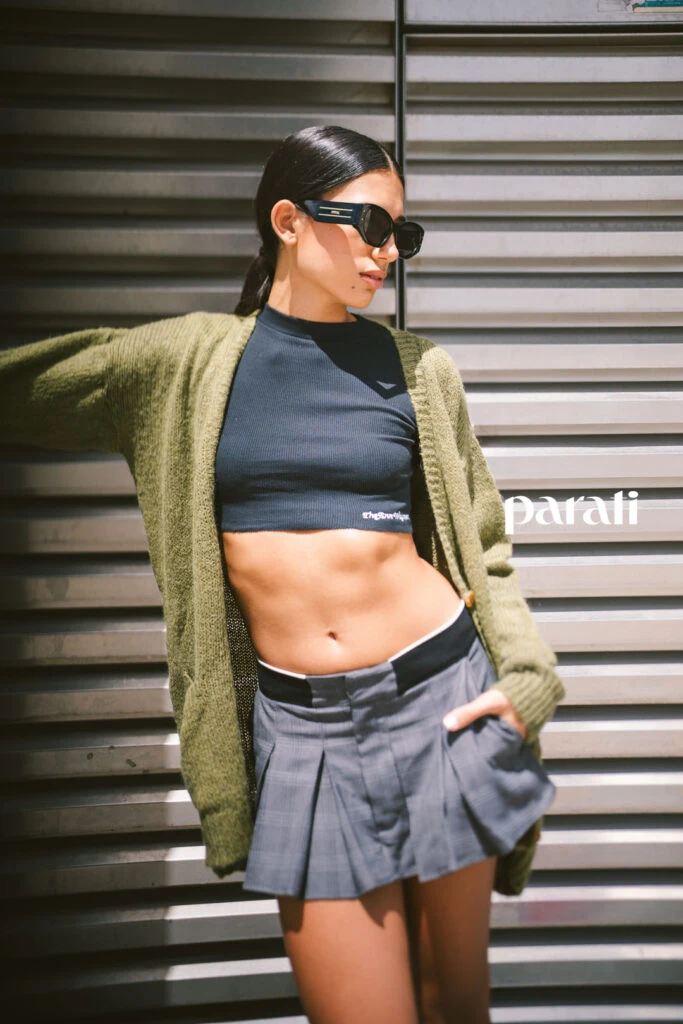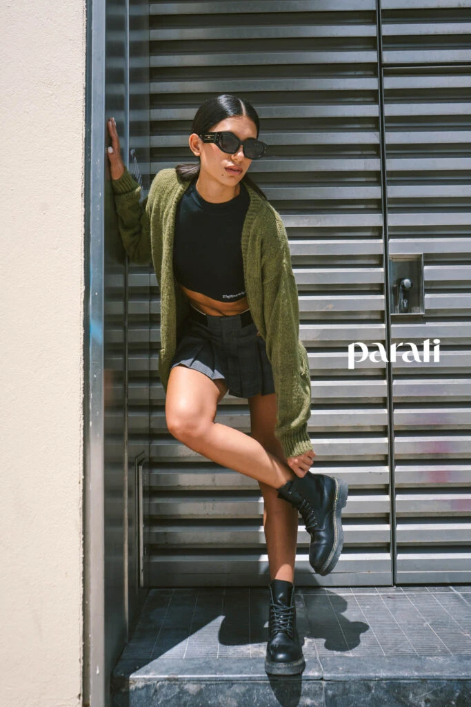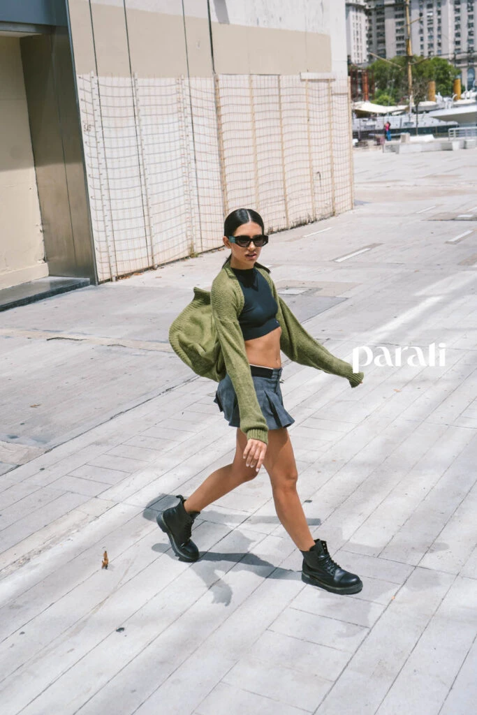 Cárdigan tejido, remera manga larga cropped y minifalda escocesa con tablas (The Ann Wagners, @theannwagners), borceguíes de cuero ecológico (Make Arg, @makearg) y anteojos de sol (Orbital, @orbitaloficial).