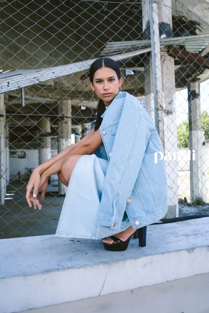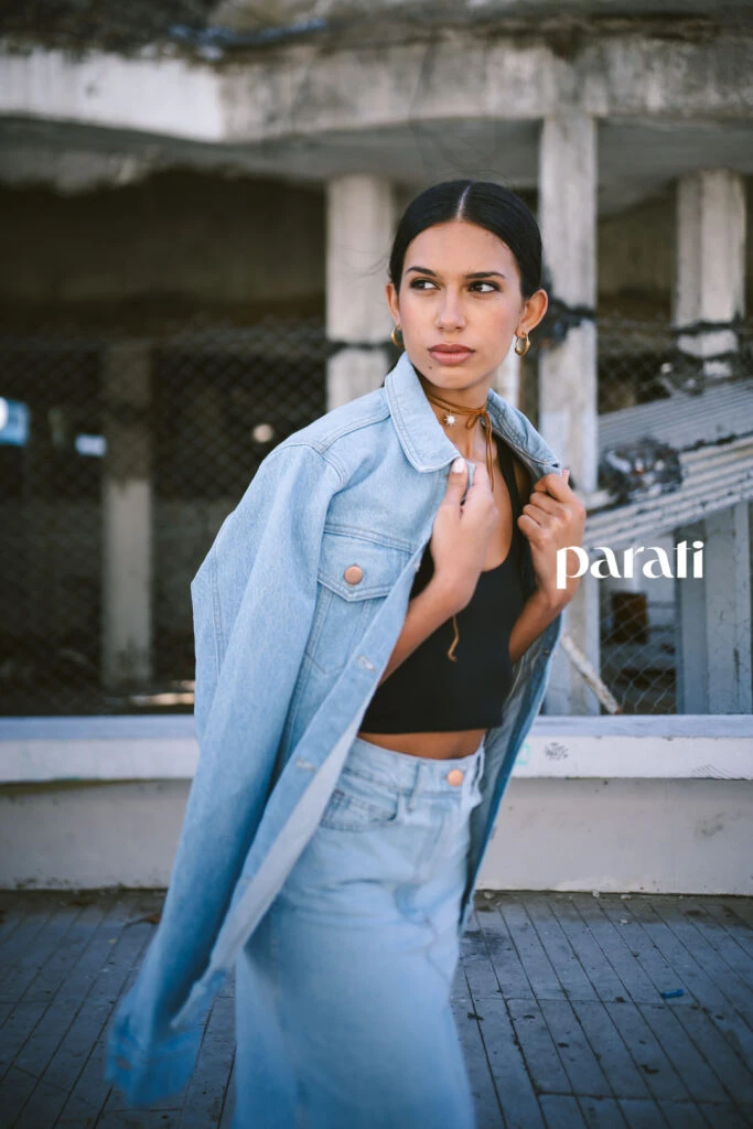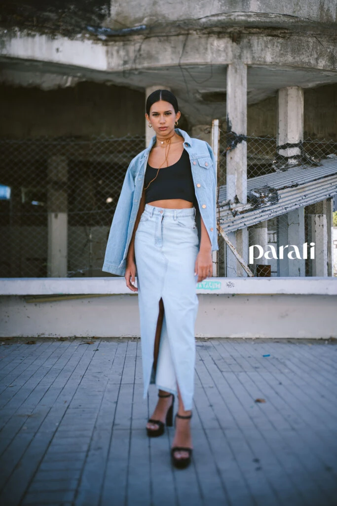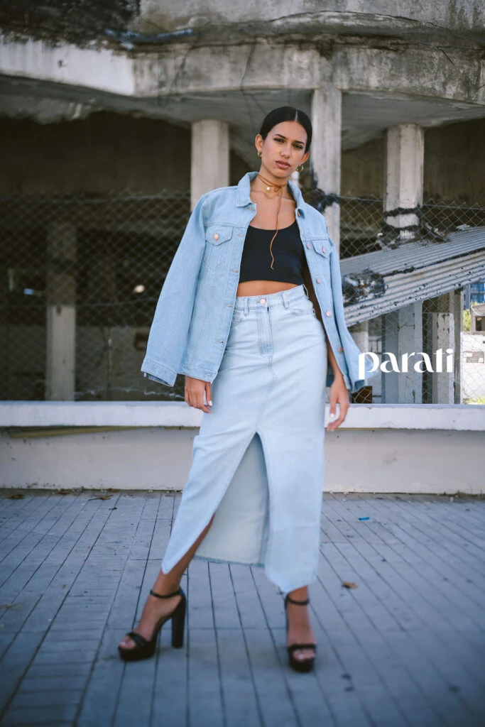 Campera oversize, falda de denim y top elastizado (RAD, @somos_rad), sandalias con plataforma (Paloma Paz, @palomapazshoes), aros redondos y collar de gamuza con dije (Atrevete Accesorios, @tiendaatrevete).