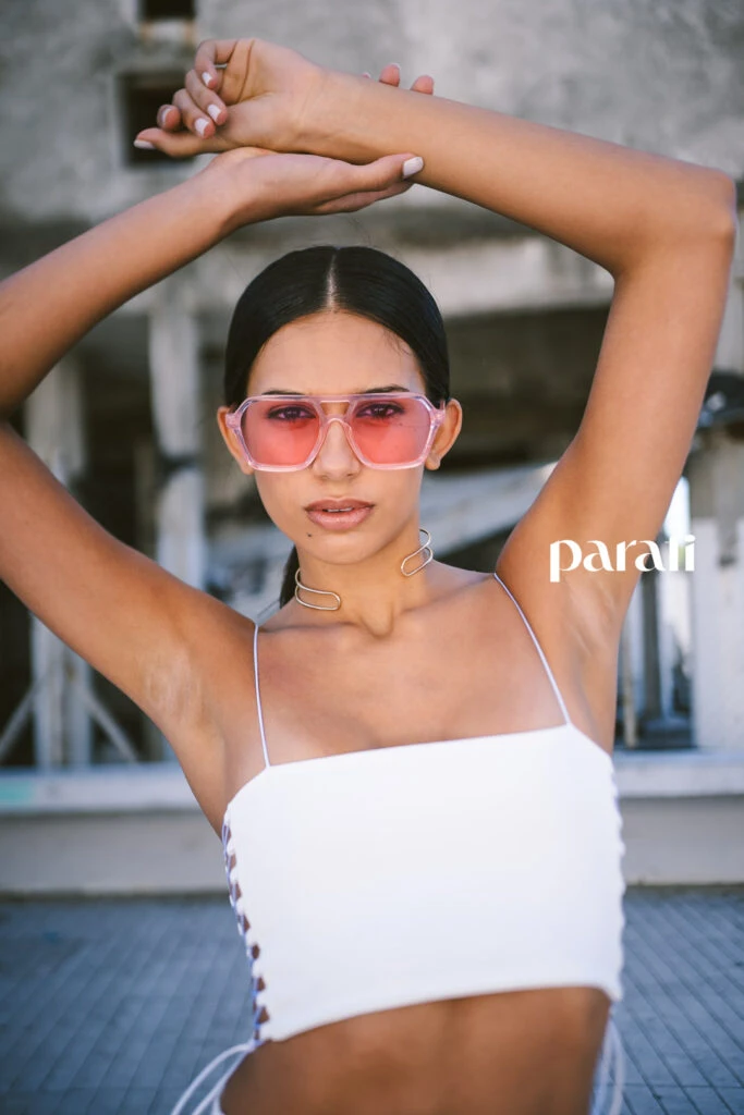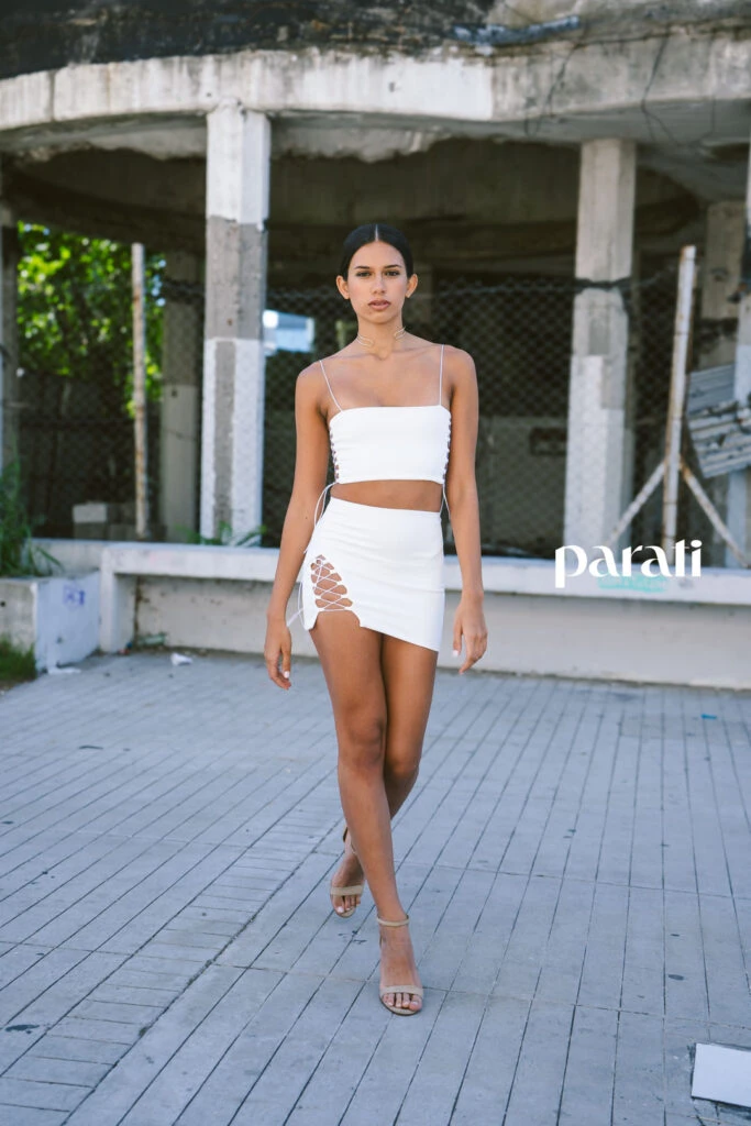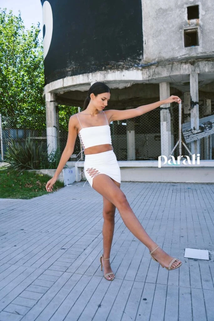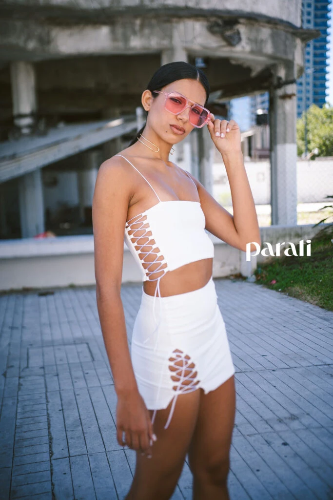 Top y falda con lace up (Lalapont, @lalapontoficial), anteojos de sol con filtro de color (Orbital, @orbitaloficial), choker dorado (Atrevete Accesorios, @tiendaatrevete) y sandalias de gamuza (Paloma Paz, @palomapazshoes).