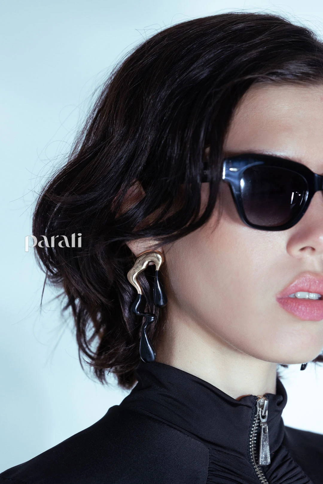 Vestido negro drapeado con cierre en el frente @melocotonstyle Anteojos de sol @hardem_official medias traslúcidas @moraoficial.ok y sandalias altas de glitter @achicadelosstilettos Aros de metal y esmalte y brazaletes de metal dorado @lunagarzonaccesorios