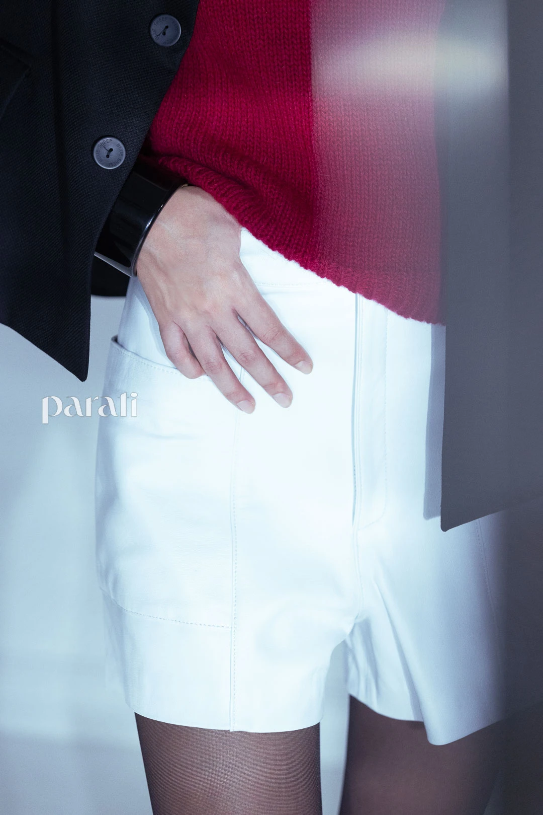 Capa corta, chaleco de lana y shorts de cuero @bluesheepba Medias traslúcidas @moraoficial.ok y mocasines de gamuza @pulidshoes Pulsera de resina @lunagarzonaccesorios