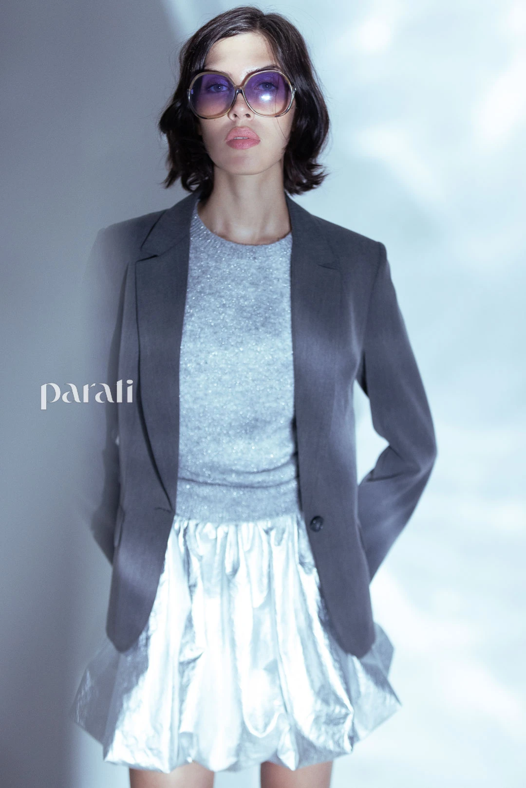 Saco recto, sweater mangas cortas de lana y lúrex y mini balloon metalizada @claraibarguren