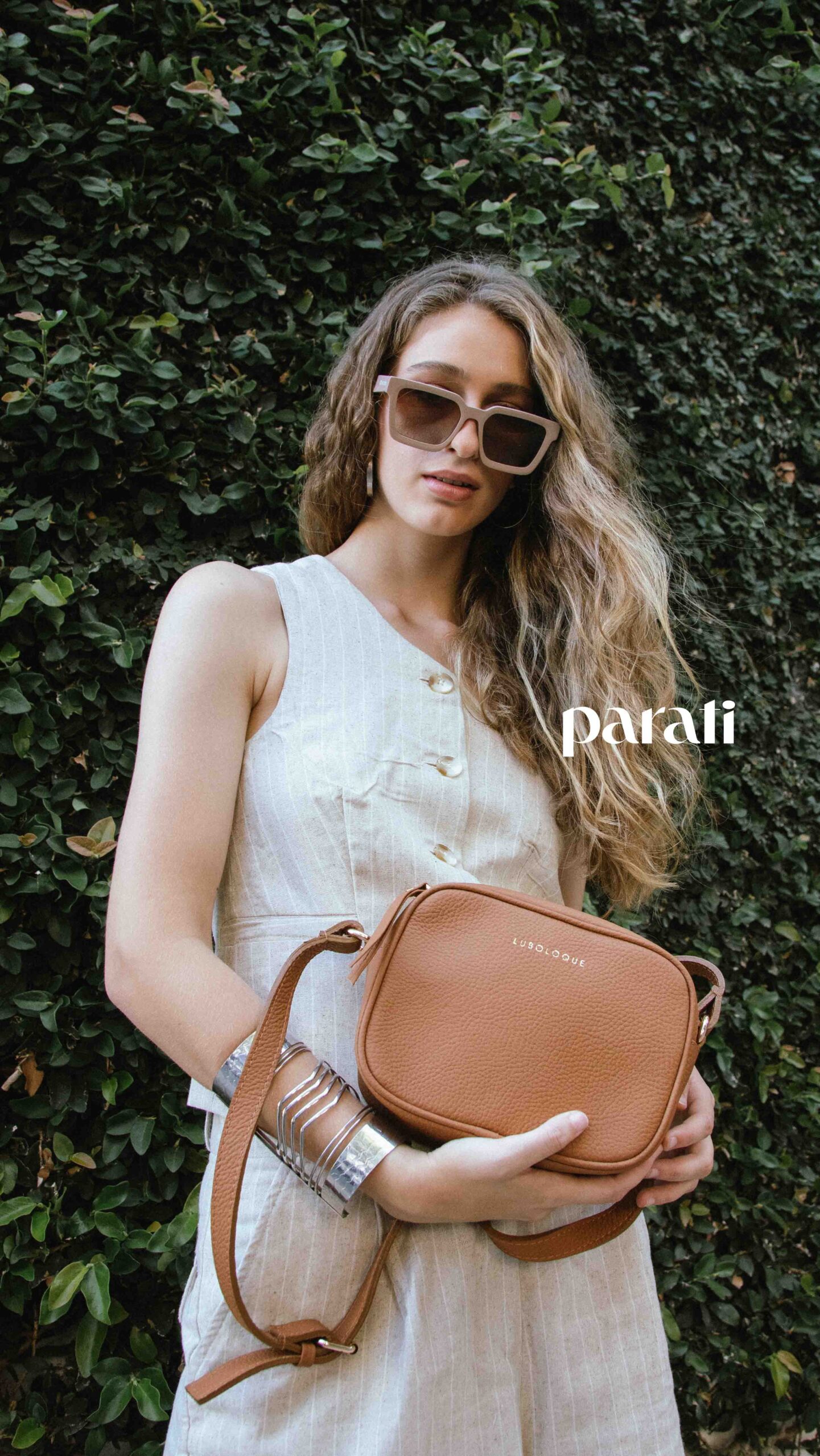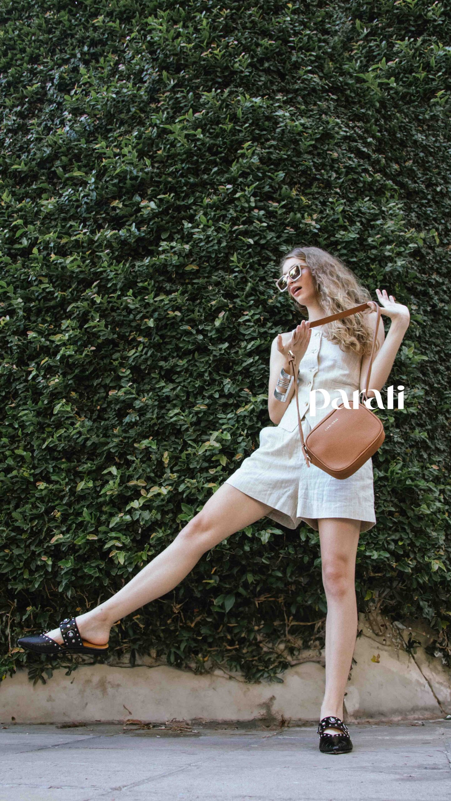 Chaleco de un hombro y short de lino (Tefka Studio, @tefkastudio), chatas de cuero con apliques y bandolera de cuero (Lu Boloque, @luboloquebags), aros y esclava metálica (Lolas Complementos, @lolascomplementos.oficial) y anteojos de sol (Hardem, @hardem_official).