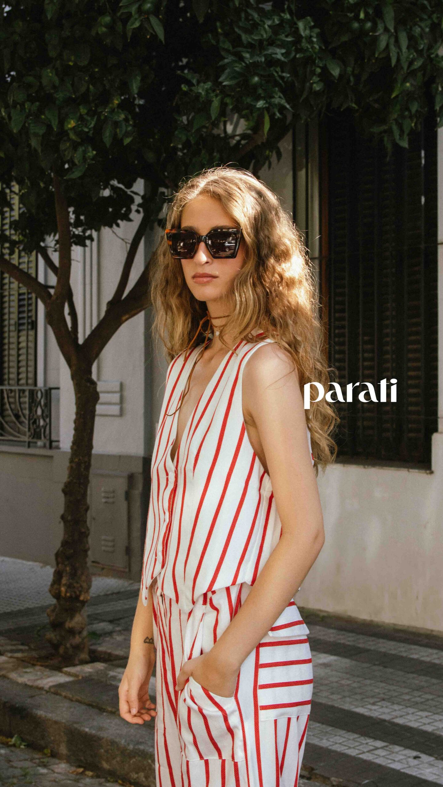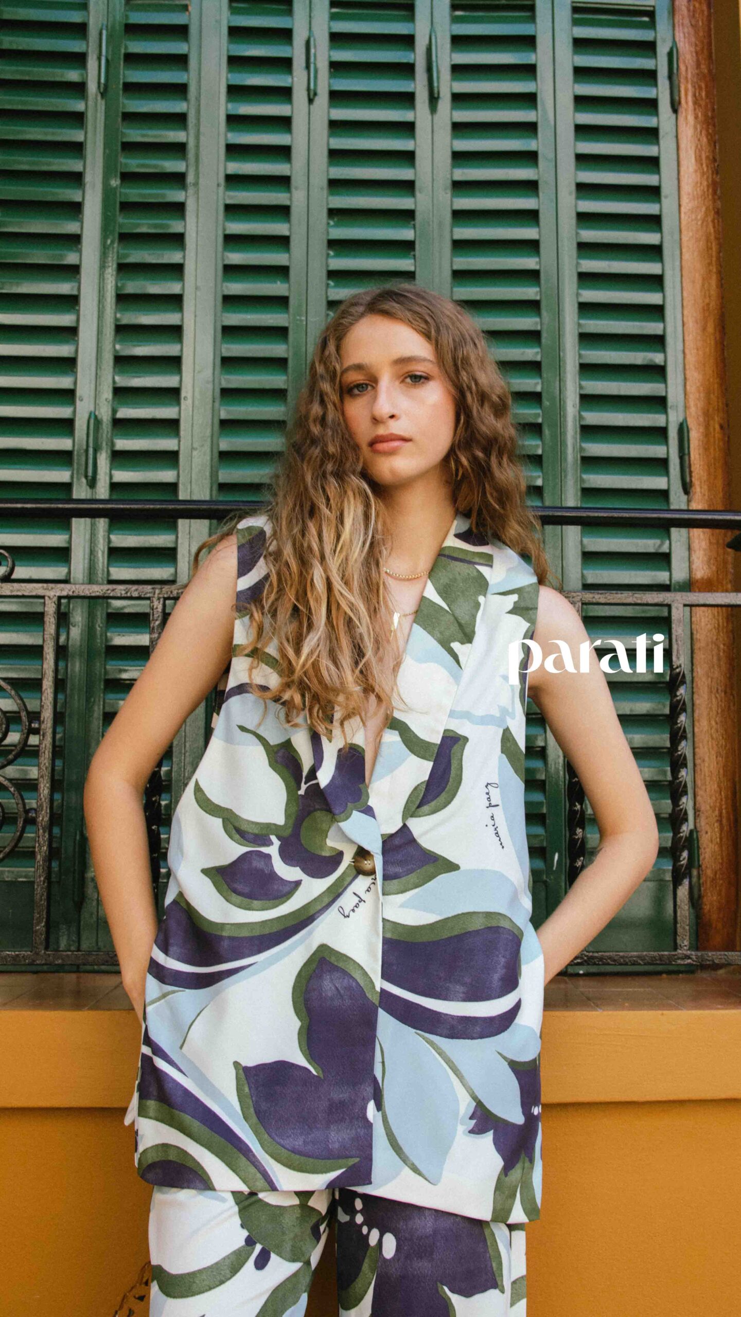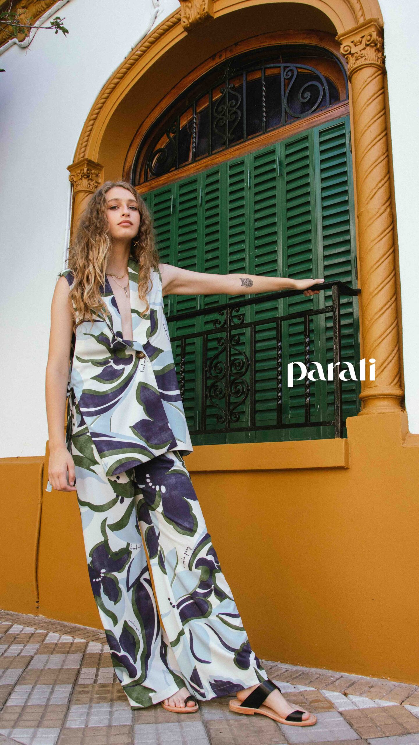 Chaleco con tajos laterales y pantalón estampado (María Paez, @mariapaezarg), sandalias de cuero (Fiskyn, @fiskynzapatos) y aros y collar con dije (Barzón, @barzon.store).