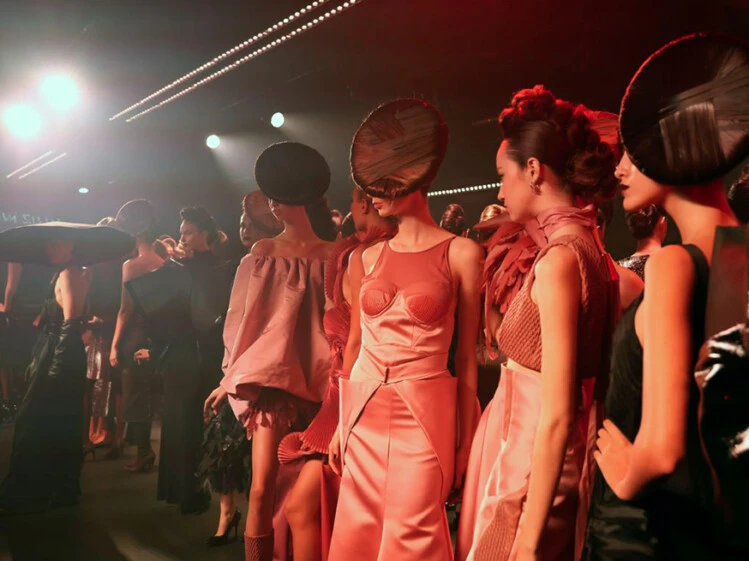 El desfile estuvo atravesado por una fuerte impronta estética japonesa, visible en siluetas tipo pagoda, estructuras contrapuestas y un expresionismo marcado en el beauty look.