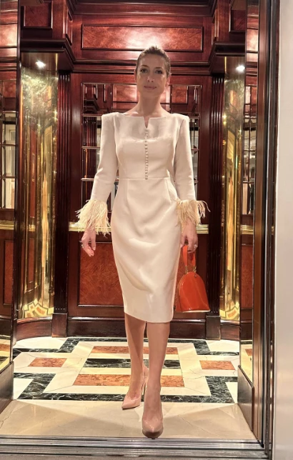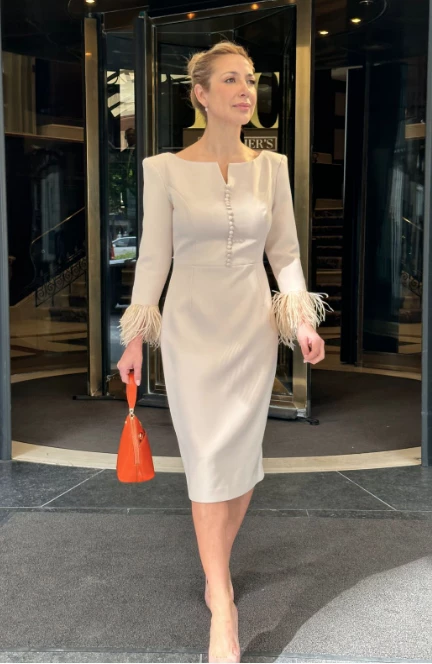 Para la ocasión, la Primera Dama argentina adoptó un elegante y delicado vestido en color nude de Cynthia Martos. Un diseño con cuello a la base, corte en la cintura, hombreras, una fila botones forrados al tono en el frente y mangas al codo con terminación de plumas, un detalle de tendencia súper chic.